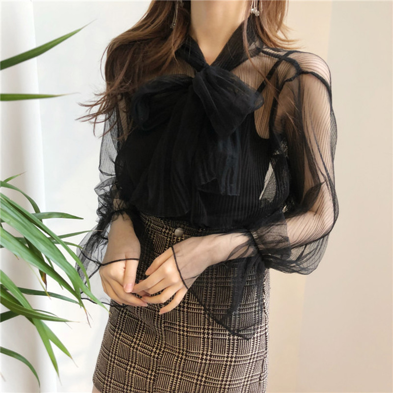 / 早春新款女裝短款吊帶背心+薄款透視系帶蝴蝶結網紗上衣學生套裝
