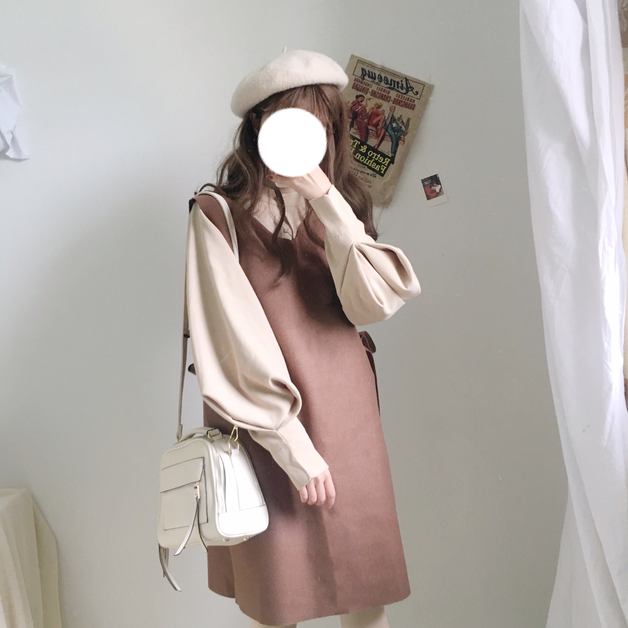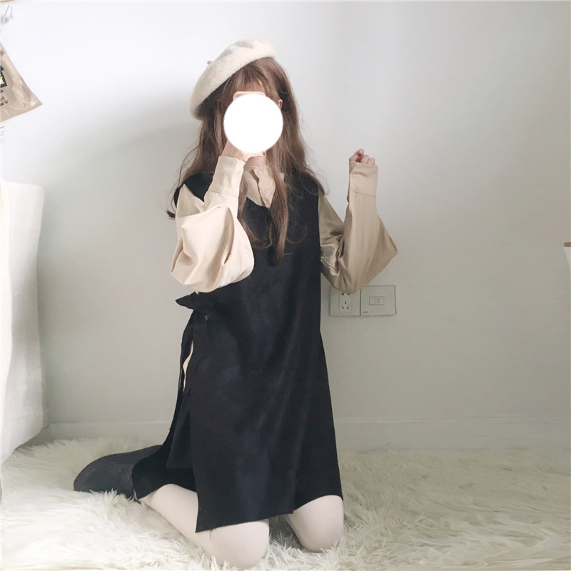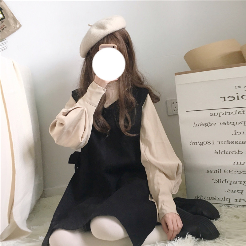/ 韓版時尚休閑套裝秋季chic復古純色襯衣+毛呢背心連衣裙兩件套女
