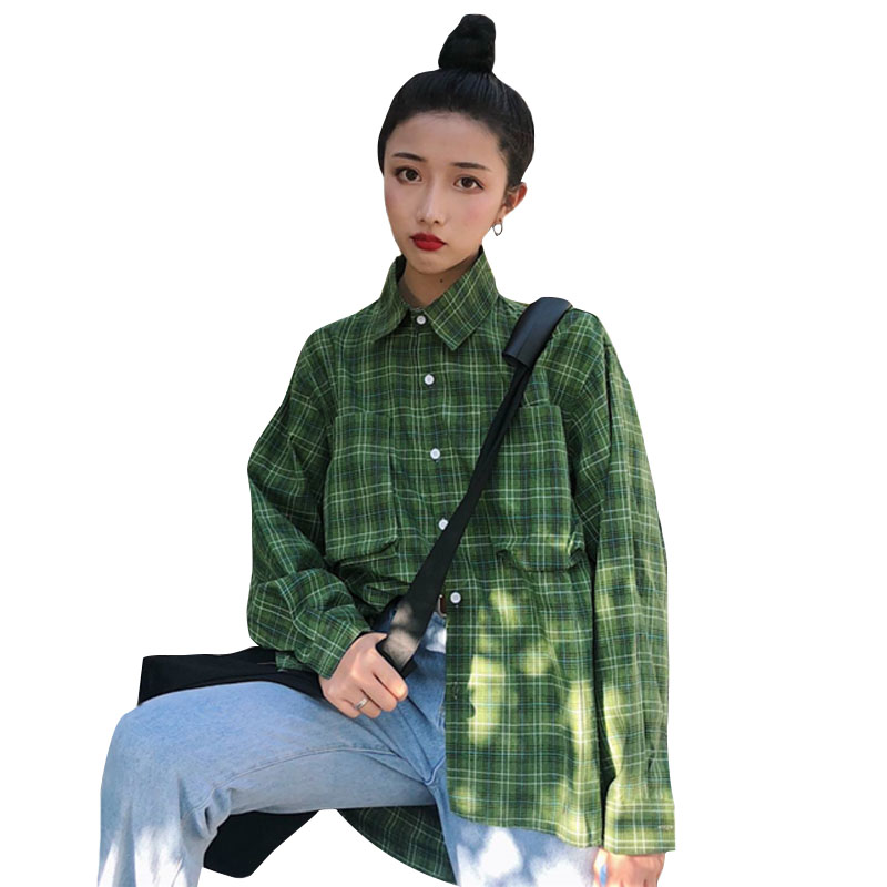 / 秋季女裝韓版復古港風綠格子中長款BF風寬松長袖休閑襯衫上衣外套