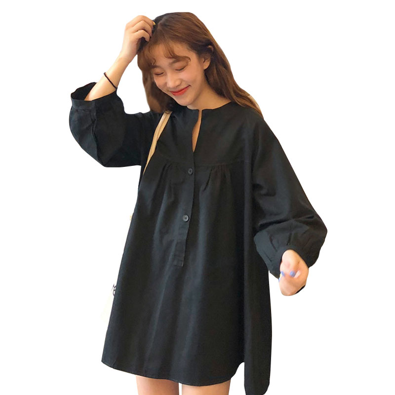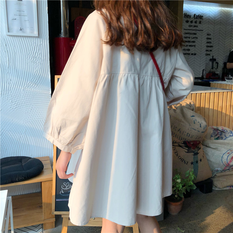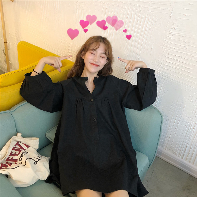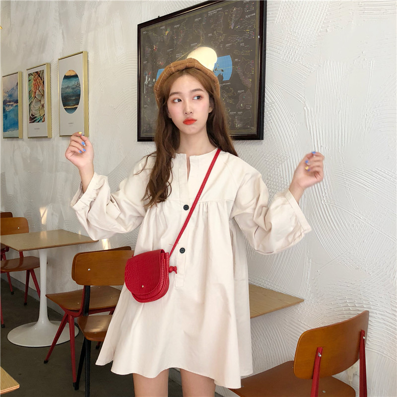 / 秋季韓版寬松顯瘦氣質小心機V領中長款連衣裙短裙學生長袖裙子女