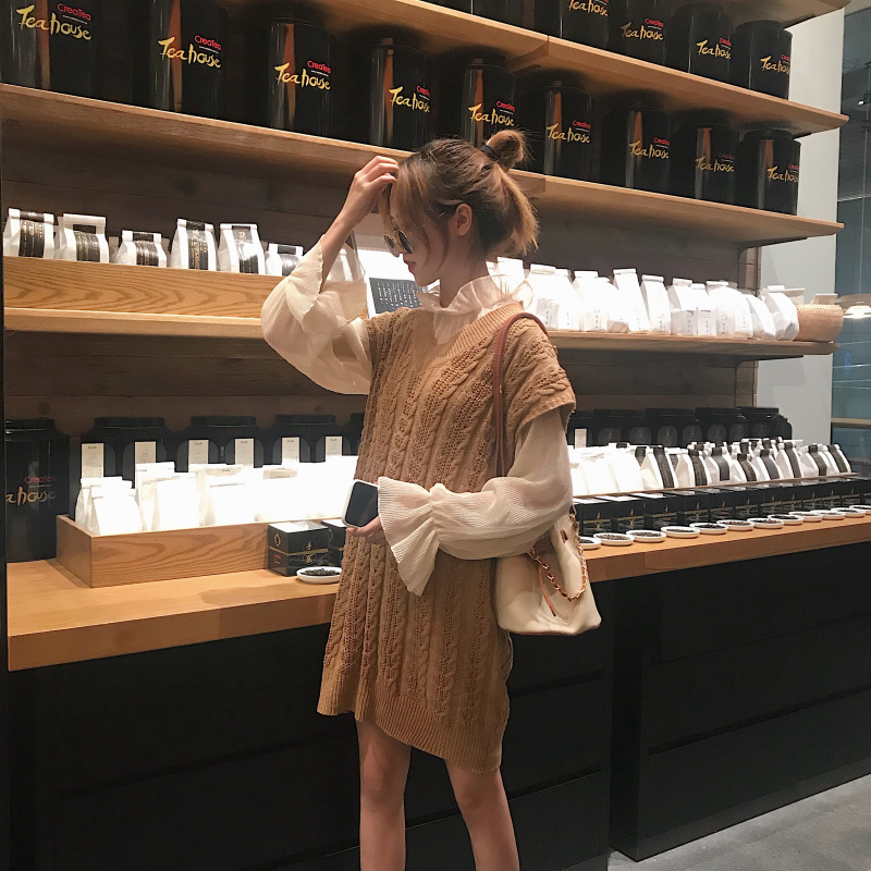 / 韓版時尚休閑套裝秋季中長款毛衣針織馬甲背心+雪紡襯衫兩件套女