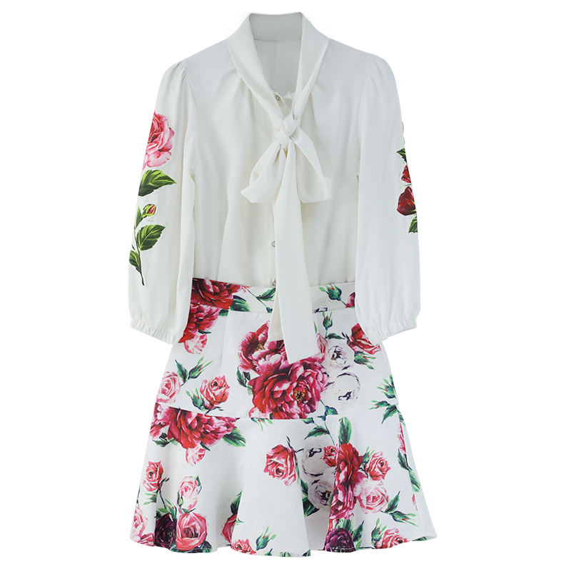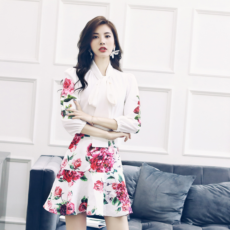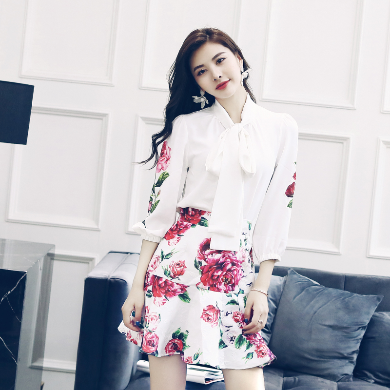 / 名媛氣質2018新款小個子印花花朵長袖上衣襯衫短裙半身裙兩件套裝