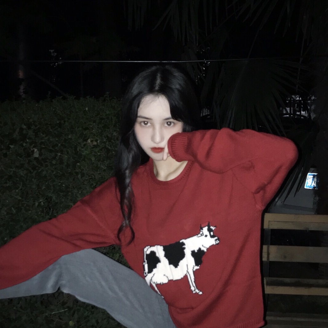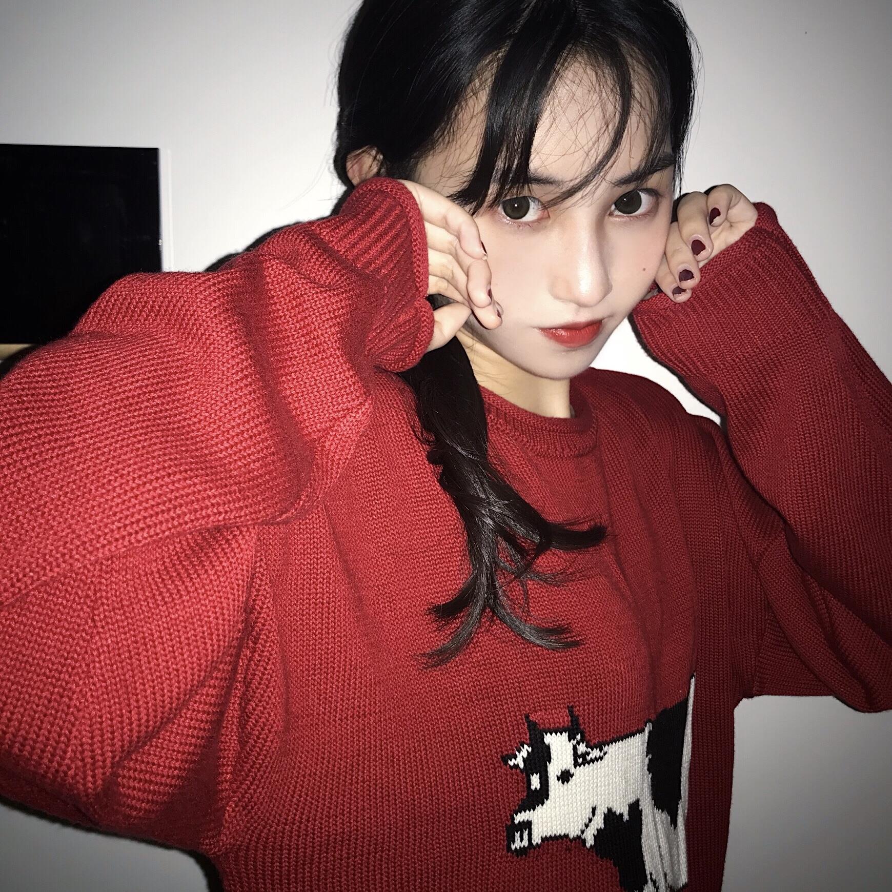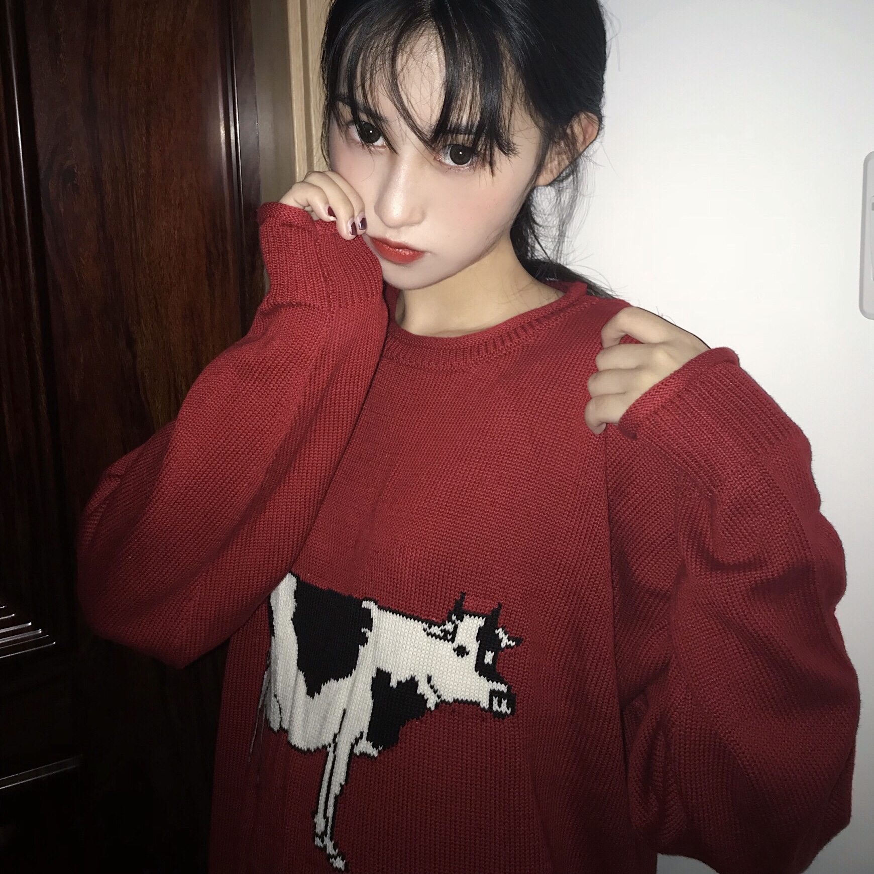 / 秋冬女裝韓版寬松卡通奶牛卷邊紅色網紅套頭針織衫毛衣上衣外套潮