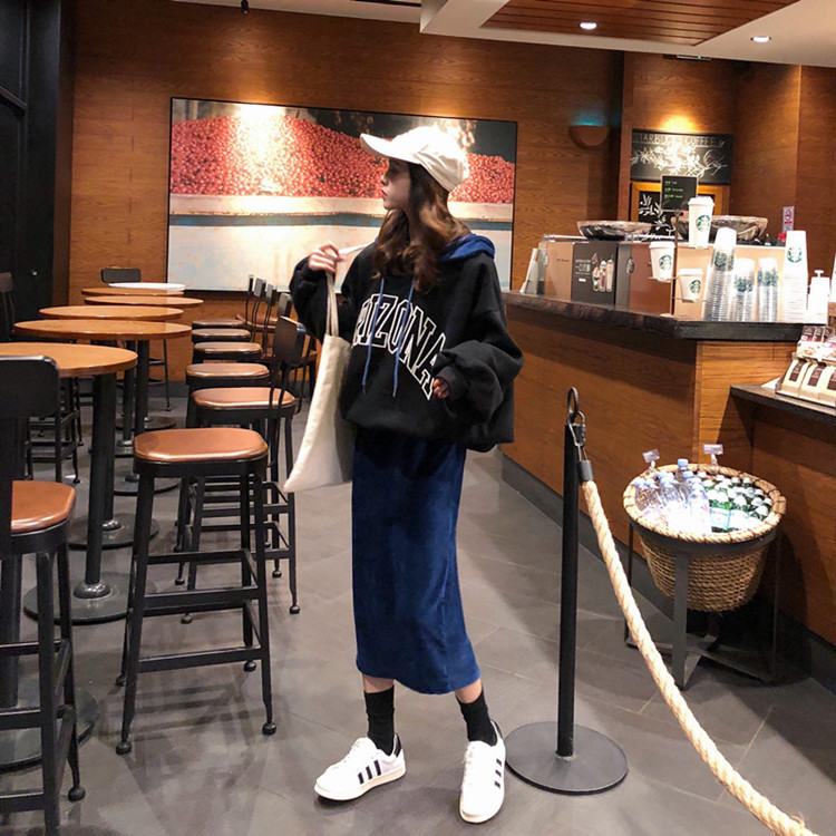 / 韓版時尚休閑套裝秋冬女裝字母刺繡連帽加絨衛衣+半身長裙兩件套