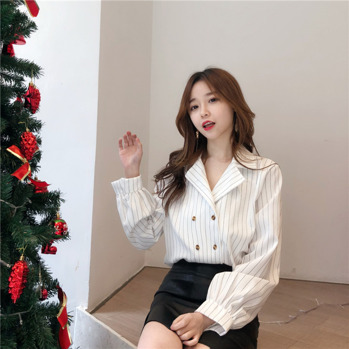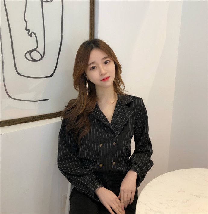 / 春裝韓版港味雙排扣西裝領復古條紋上衣女百搭寬松長袖襯衫上衣潮