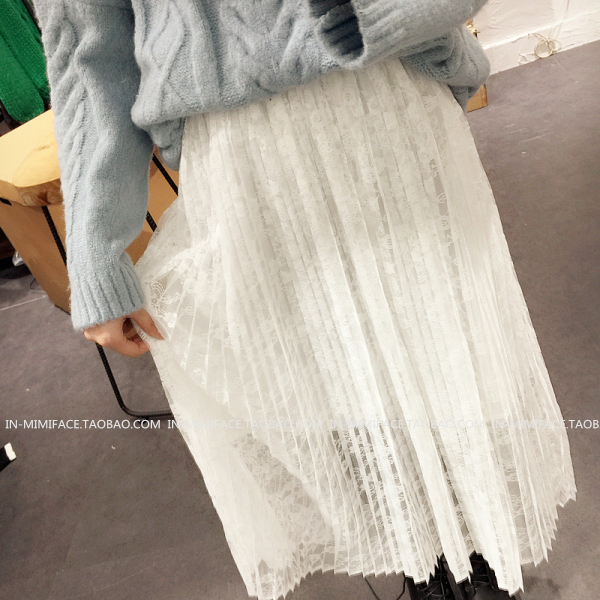 / 春夏新款2018女裝裙子蕾絲網紗縷空百褶裙高腰顯瘦半身裙中長裙潮