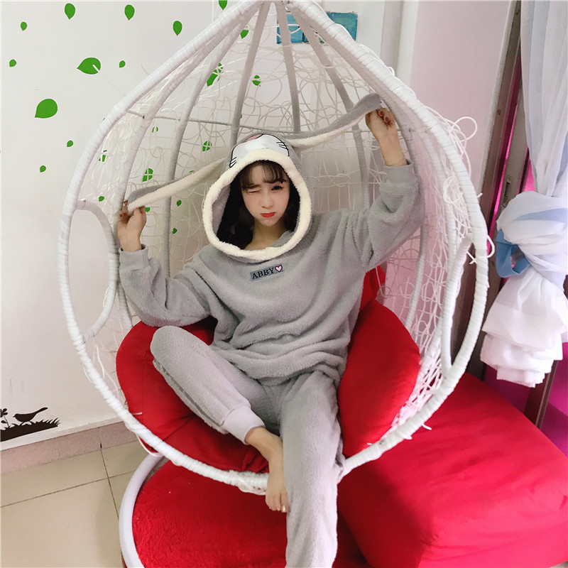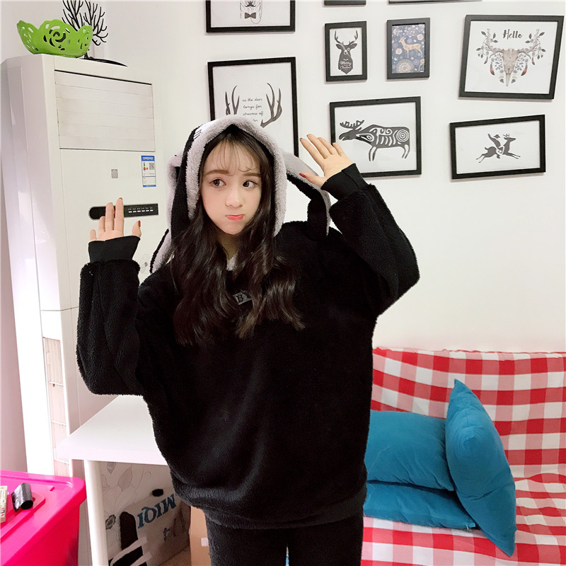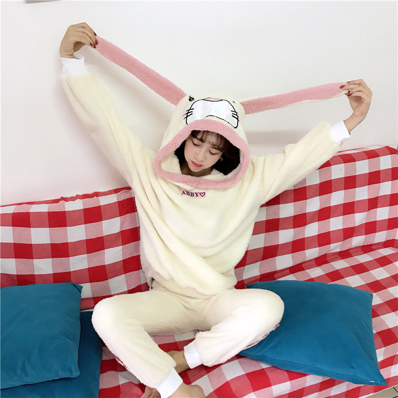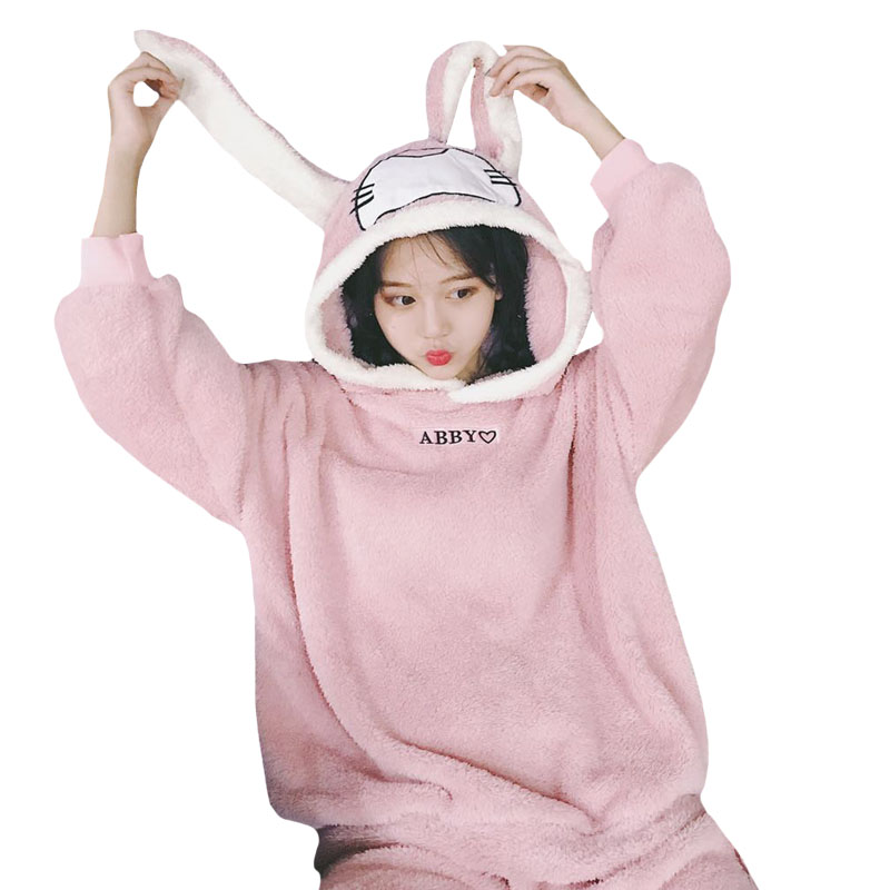/ 秋冬韓版寬松毛絨可愛兔耳朵連帽長袖睡衣睡褲兩件套家居服套裝女