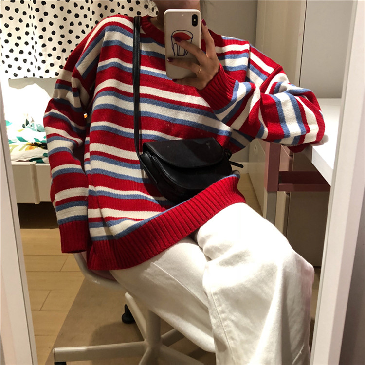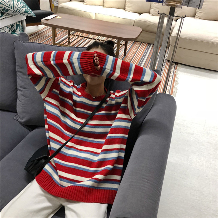 秋冬女裝韓版寬松復古慵懶風彩色條紋套頭超火毛衣針織衫上衣外套