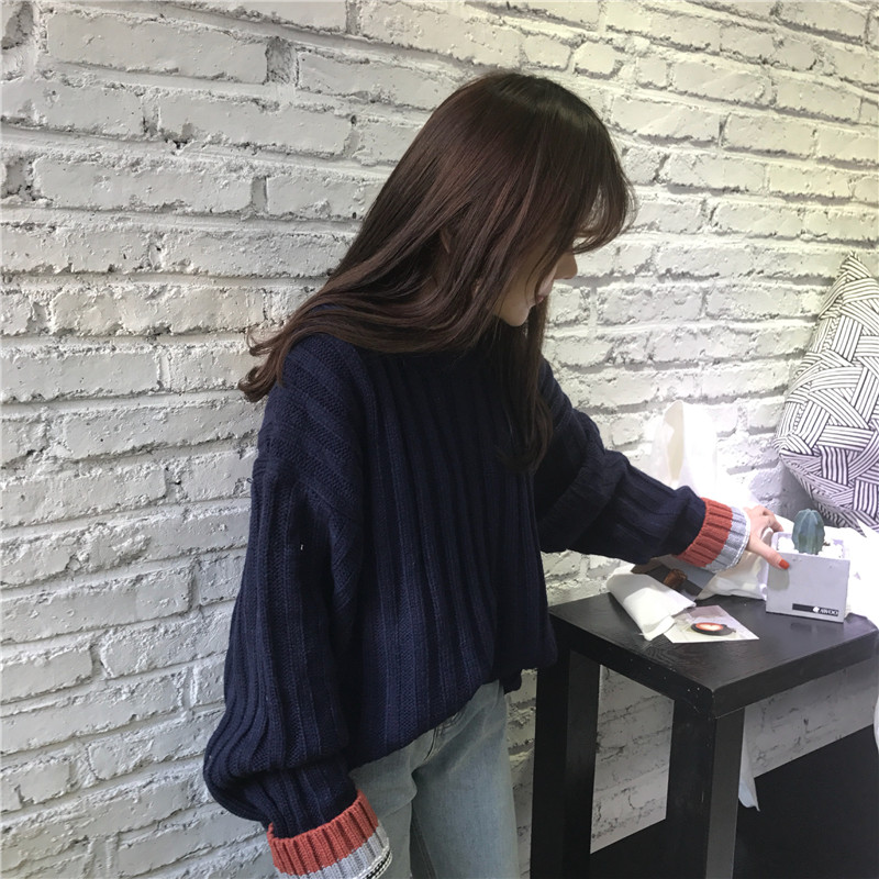 / 秋季女裝韓版撞色拼接長袖慵懶風毛衣寬松加厚套頭針織衫上衣外套