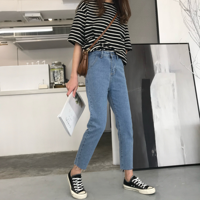 秋裝女裝韓版寬松顯瘦百搭直筒褲九分褲牛仔褲高腰簡約闊腿褲長褲