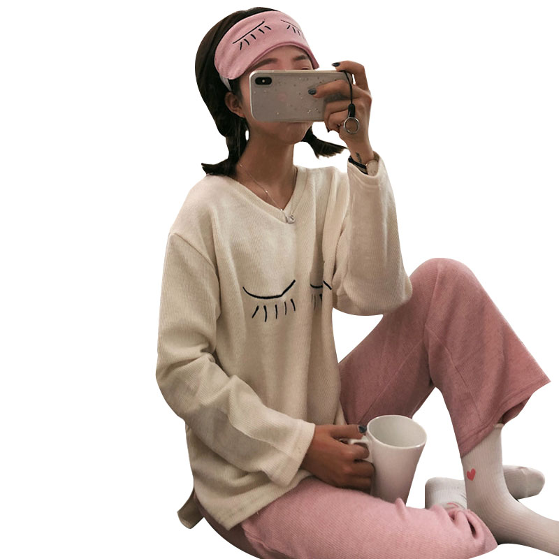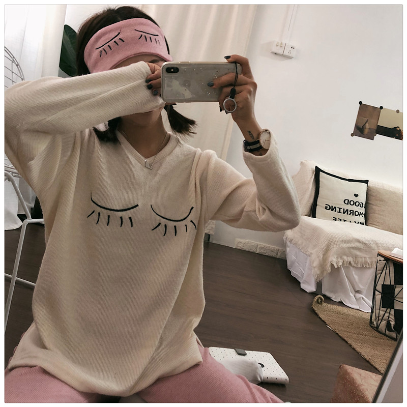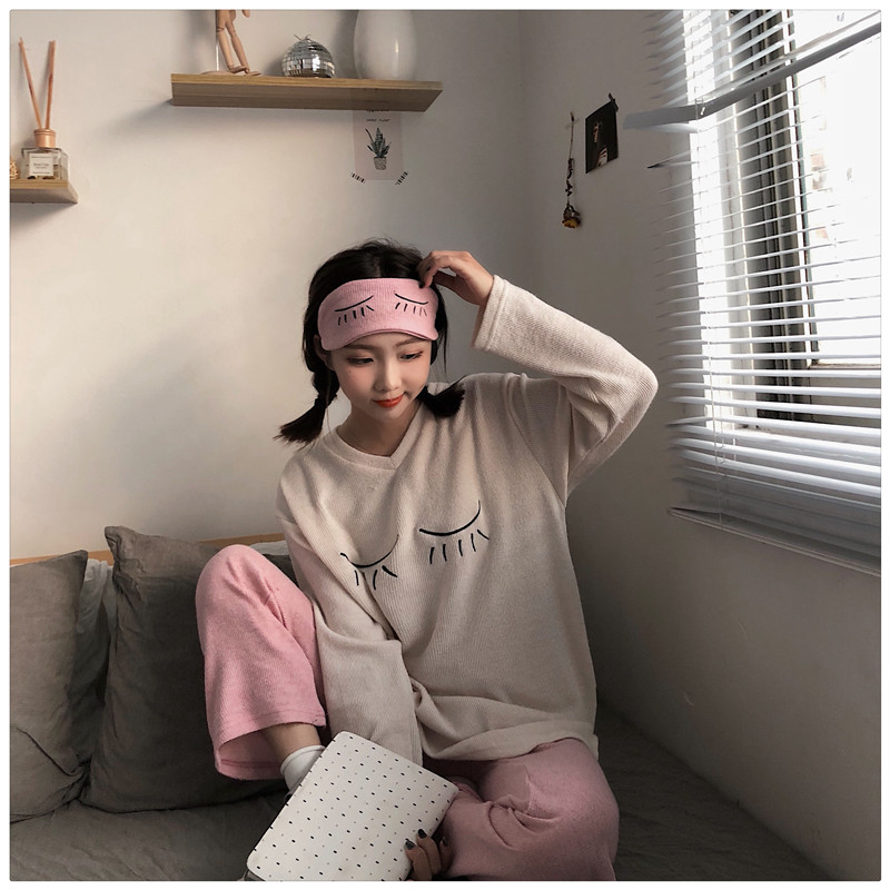 / 秋冬韓版可愛甜美睫毛刺繡家居服套裝長袖睡衣+睡褲+眼罩三件套女