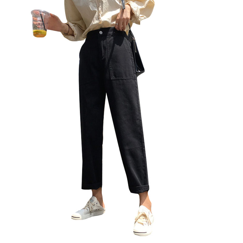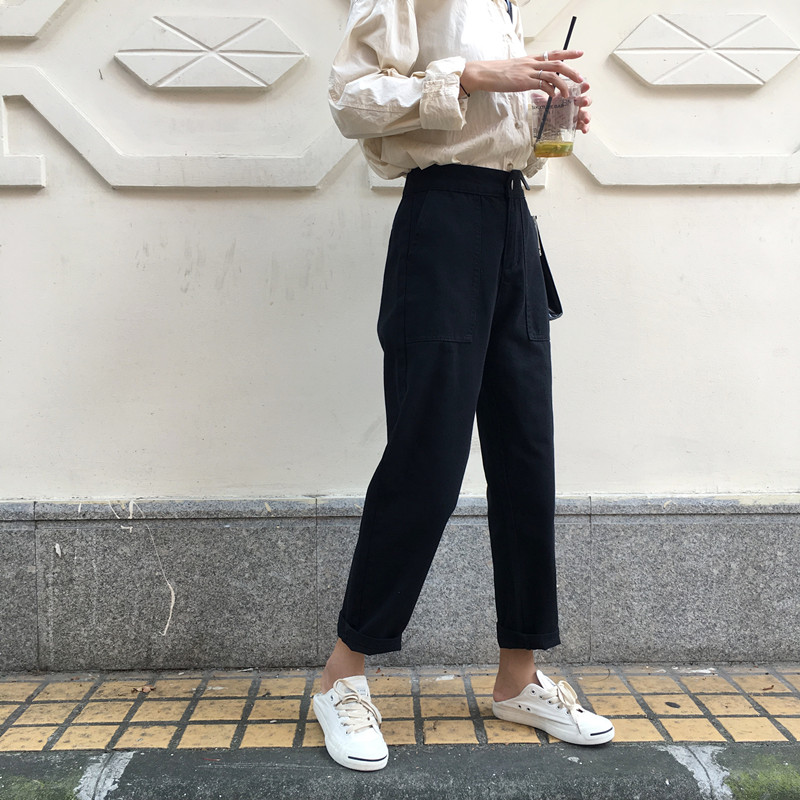 / 秋裝韓版寬松顯瘦闊腿褲牛仔褲高腰大口袋松緊腰黑色直筒褲長褲女