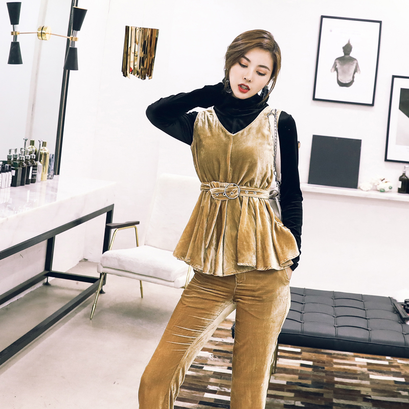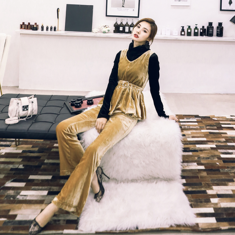/ 名媛氣質2018早秋新款女裝復古絲絨背心高領打底上衣長褲三件套裝