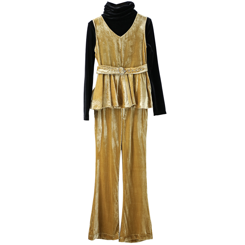 名媛氣質2018早秋新款女裝復古絲絨背心高領打底上衣長褲三件套裝