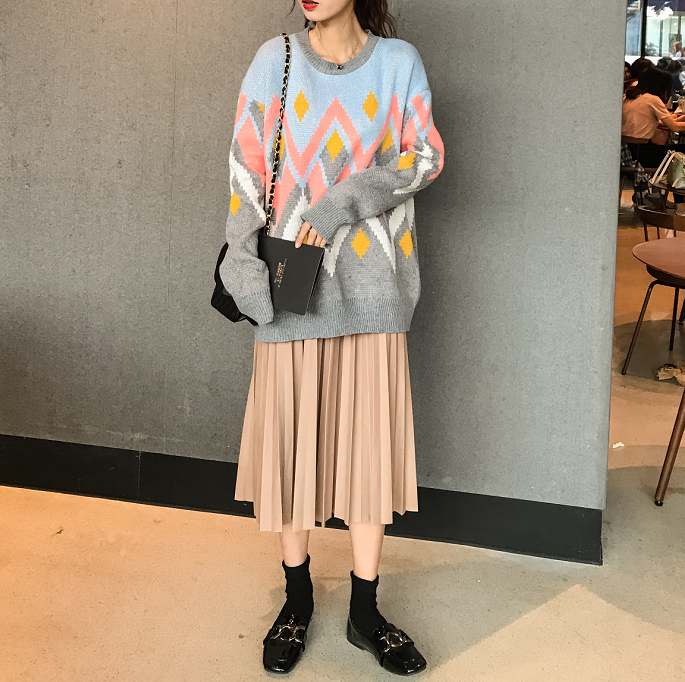 韓版時尚休閑套裝秋季撞色中長款針織毛衣+壓褶半身長裙兩件套女