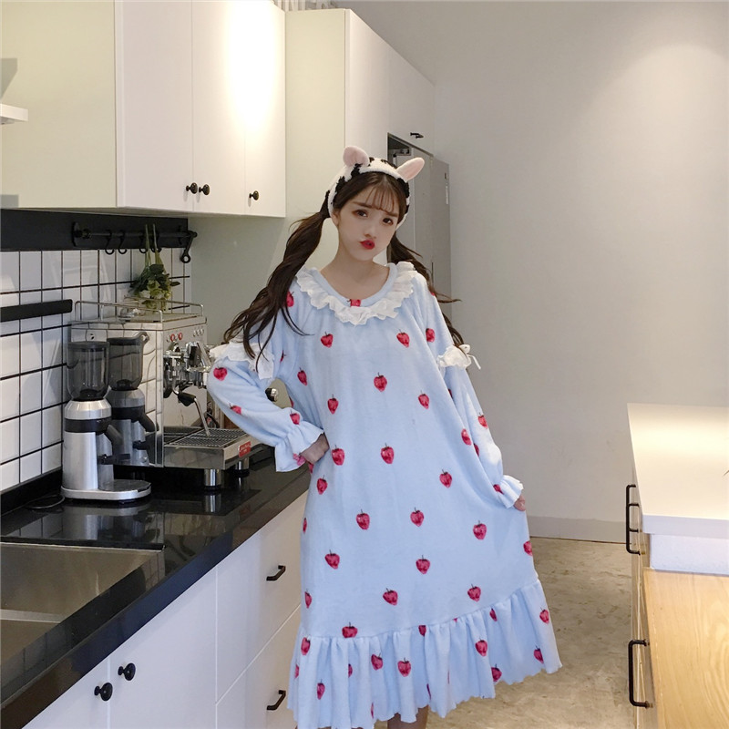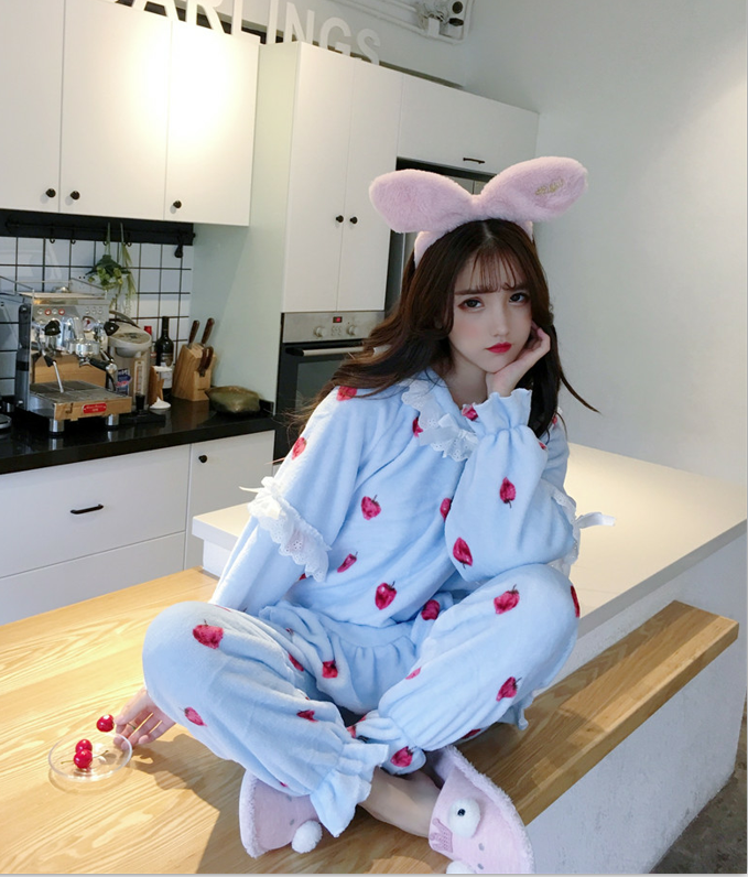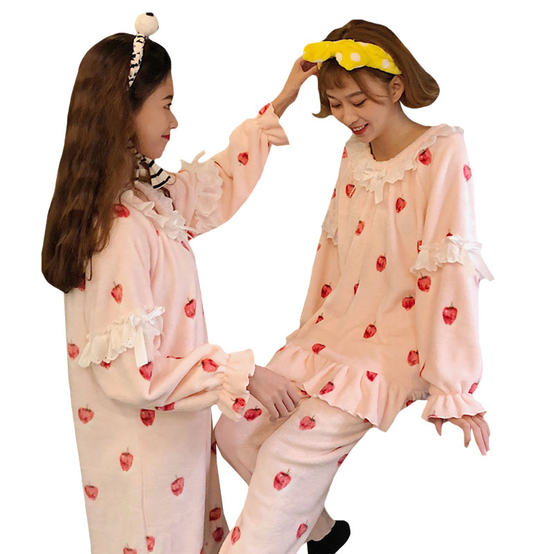 秋冬韓版加厚保暖甜美櫻桃蕾絲邊睡衣睡褲+長款睡裙家居服套裝女