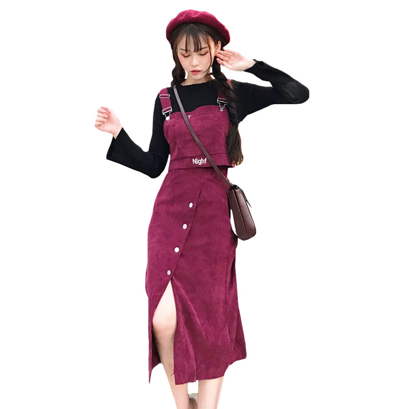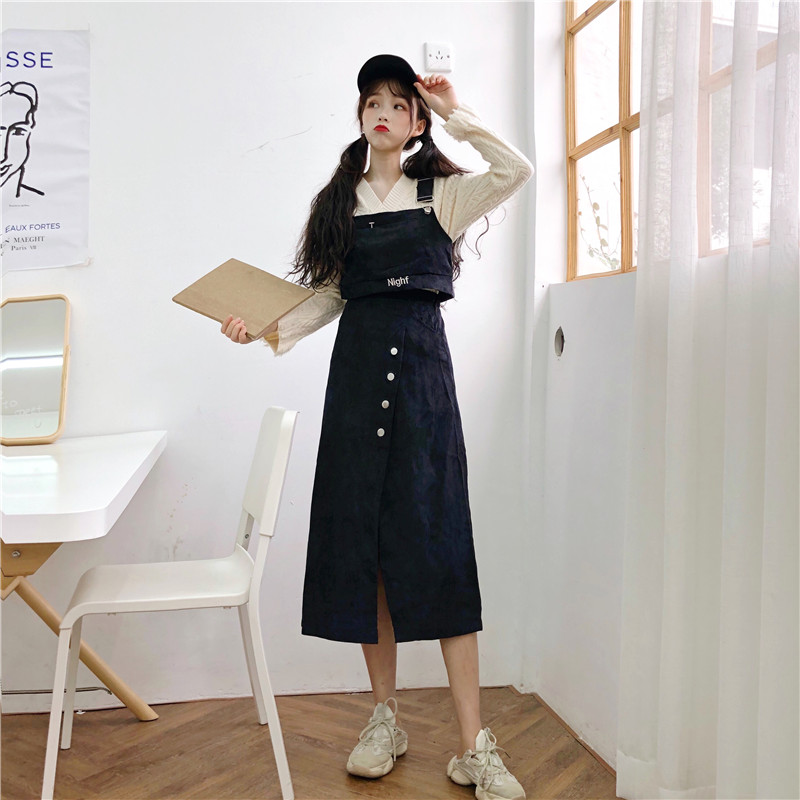 / 韓版時尚休閑套裝秋季字母刺繡吊帶馬甲背心+開叉半身裙兩件套女