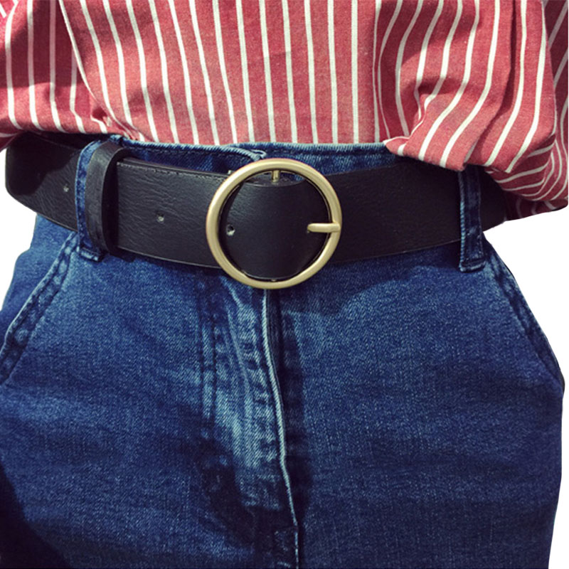 包郵 韓版2018新款潮流百搭簡約圓形金屬PU皮女式寬腰帶針扣皮帶