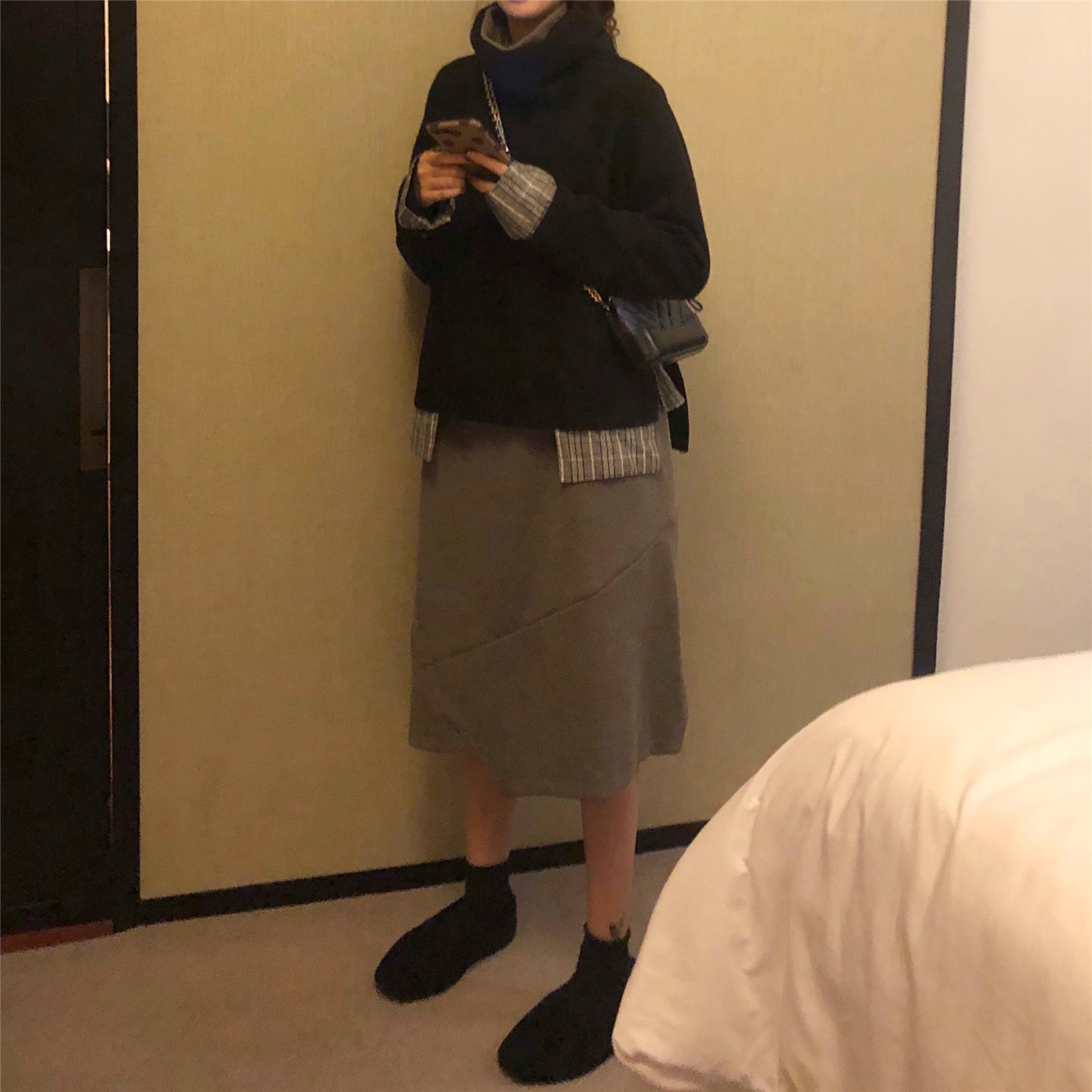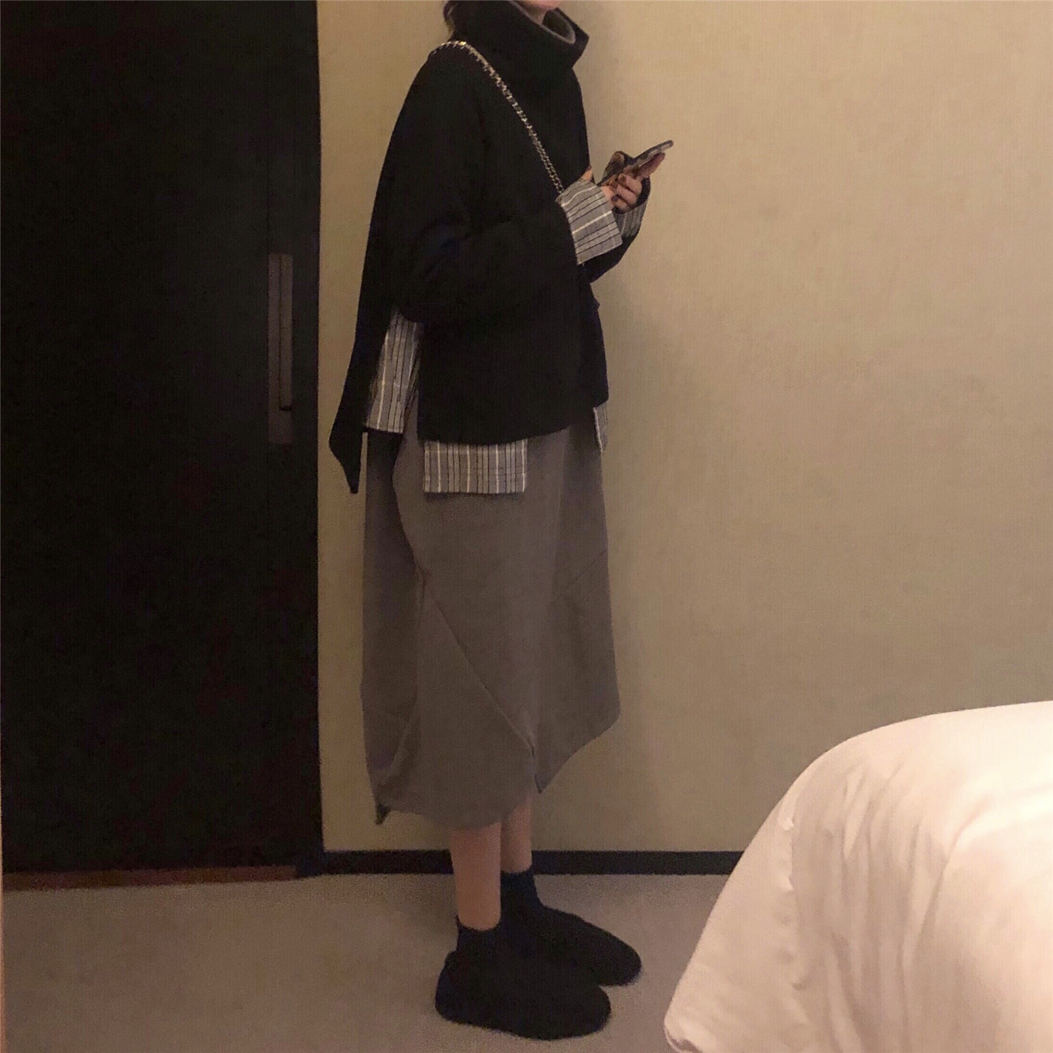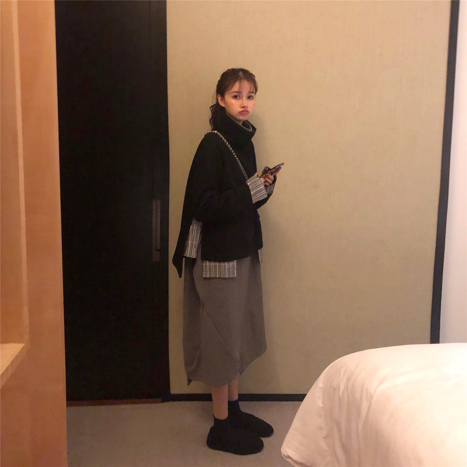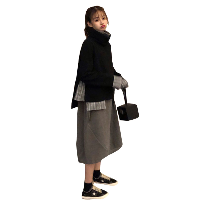 / 韓版時尚休閑套裝秋冬高領拼接呢子外套+長款打底連衣裙兩件套女