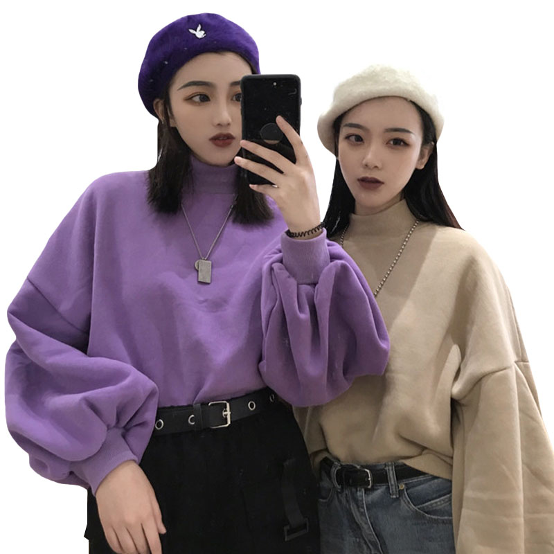 2018新款秋冬女裝韓版寬松半高領燈籠袖加絨加厚套頭衛衣上衣外套