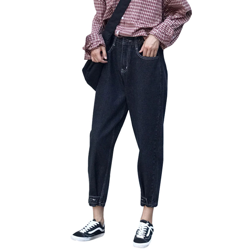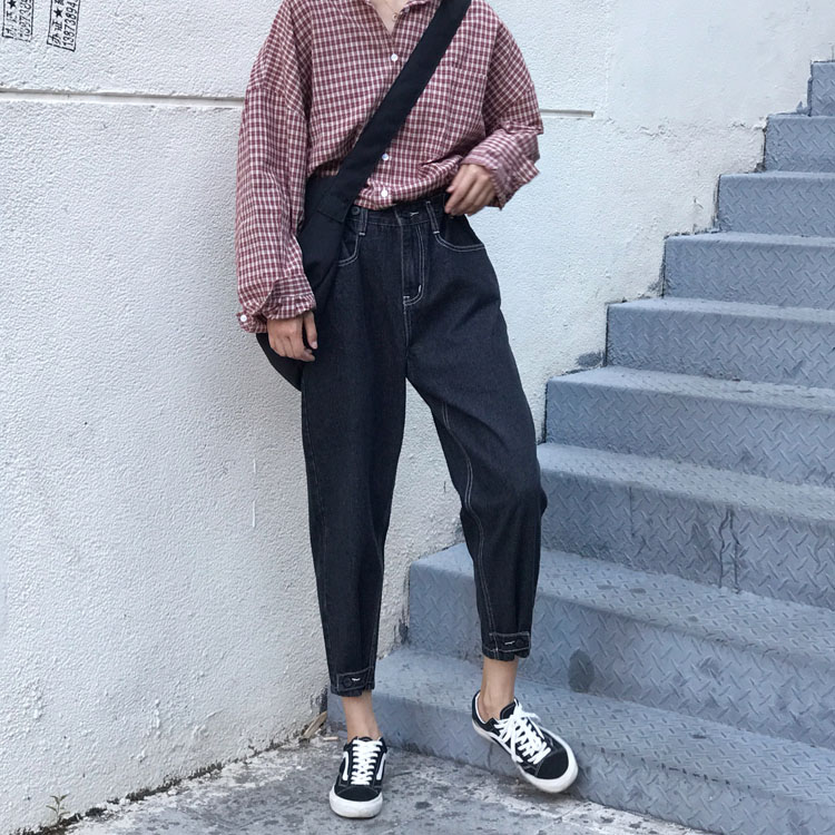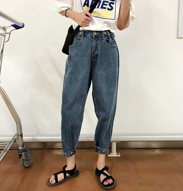 / 秋裝女裝韓版復古褲腳紐扣牛仔褲寬松高腰顯瘦直筒褲哈倫褲九分褲