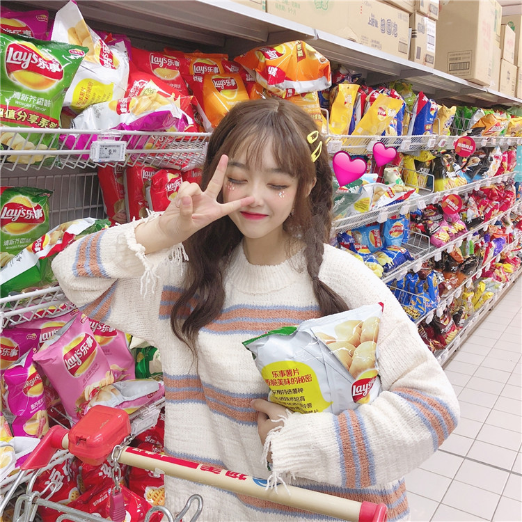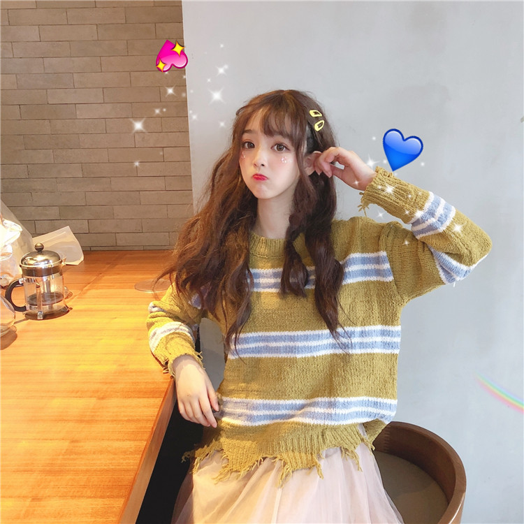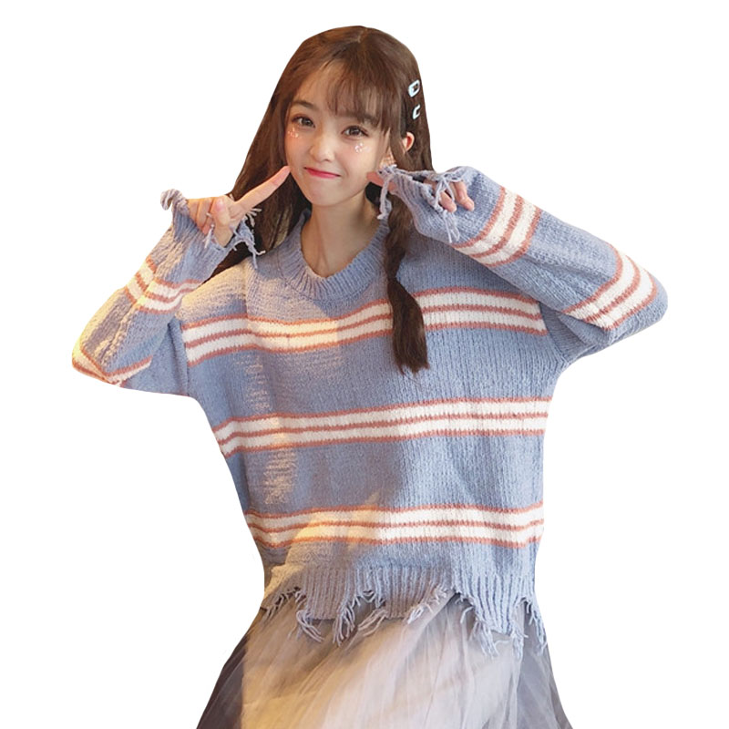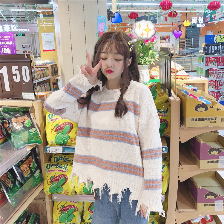 / 秋季韓版慵懶風網紅甜美不規則破洞條紋套頭寬松毛衣針織衫外套女