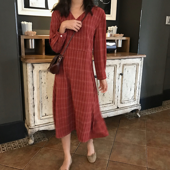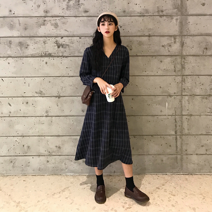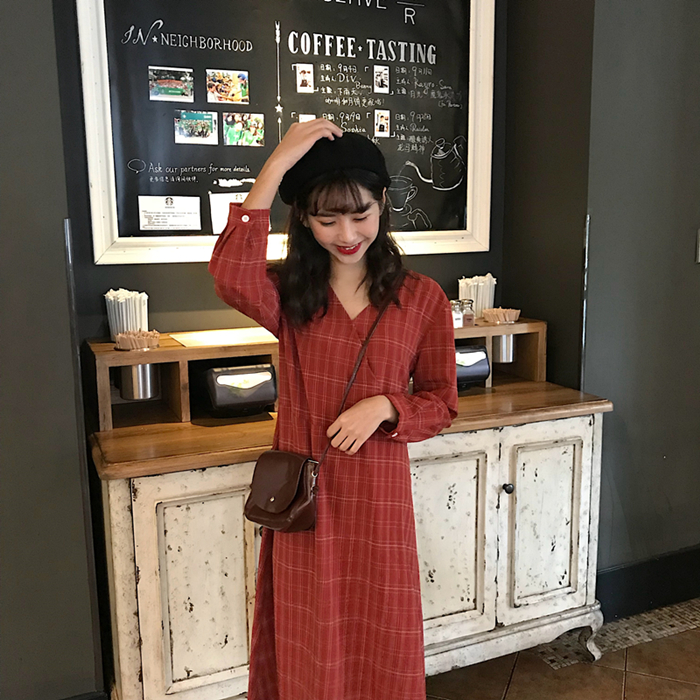 2018新款秋季女裝韓版復古氣質中長款格紋v領長袖連衣裙顯瘦長裙