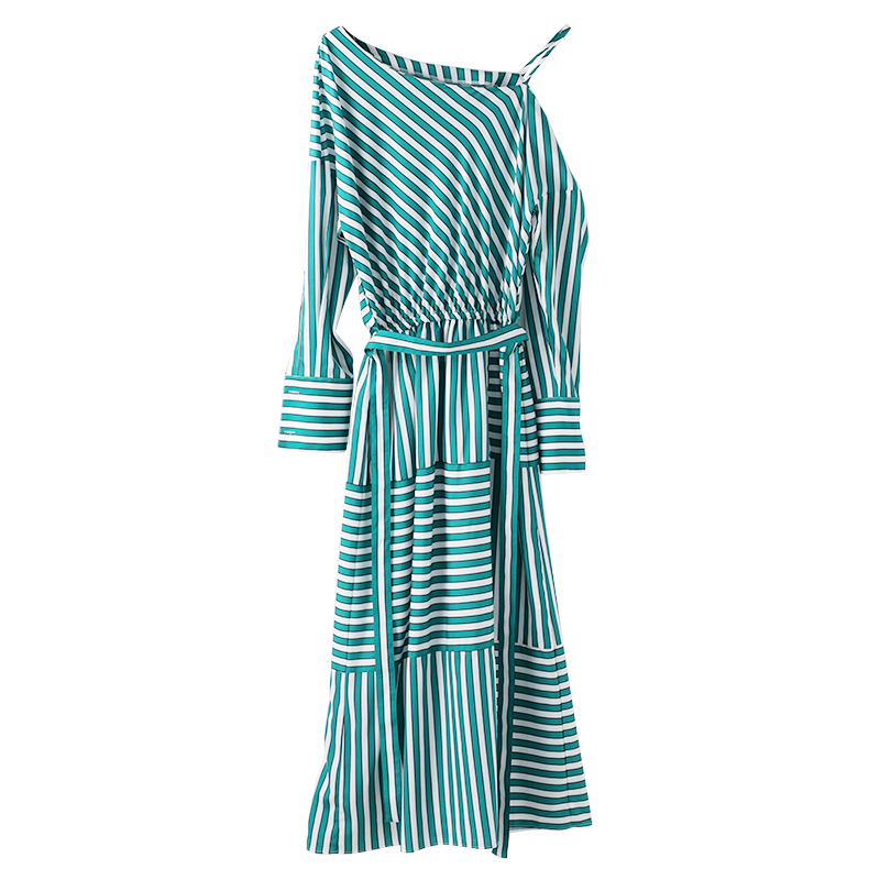 / 慵懶風港味連衣裙女2018新款夏中長條紋氣質顯瘦收腰露肩襯衣裙子