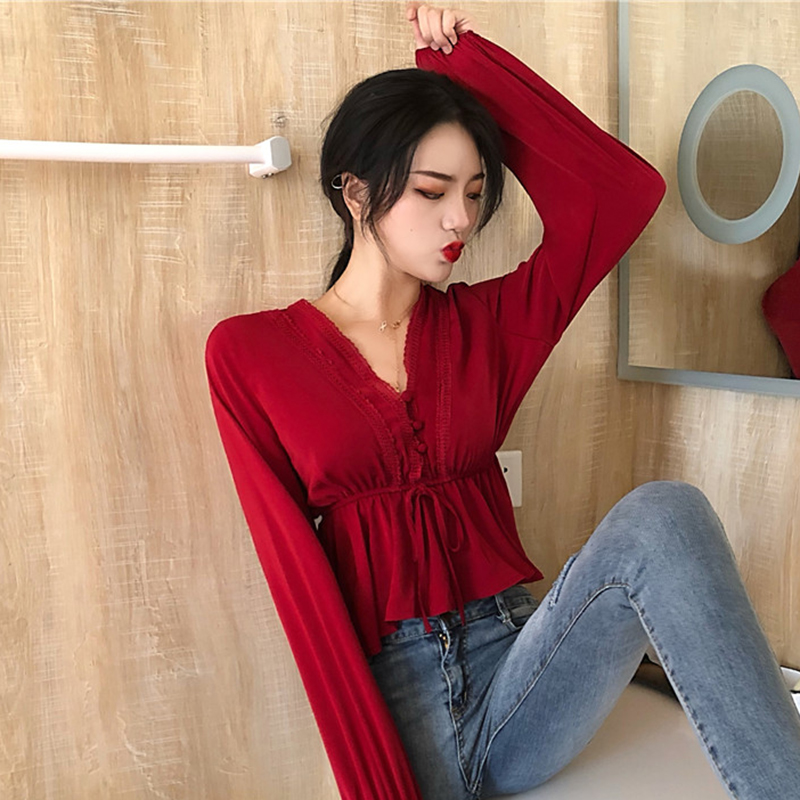 白襯衫女秋裝新款花邊V領燈籠長袖襯衣韓版百搭高腰短款氣質上衣