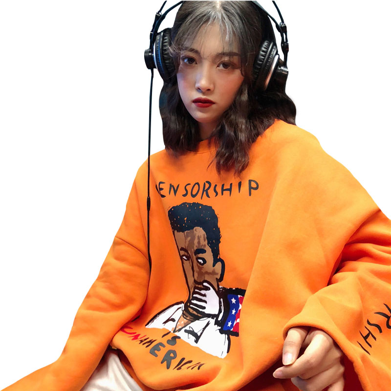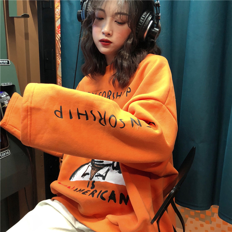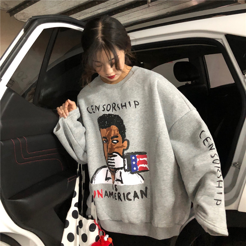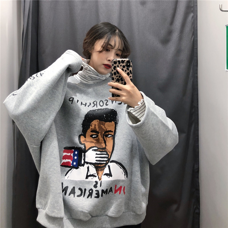 / 秋冬女裝韓版中長款寬松原宿風字母卡通加絨加厚套頭衛衣上衣外套