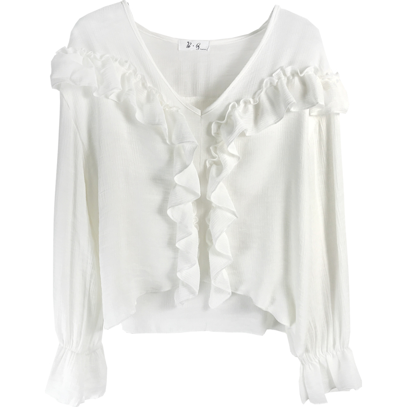 早秋2018新款女韓版黑色氣質荷葉邊V領防曬衫寬松燈籠袖雪紡上衣