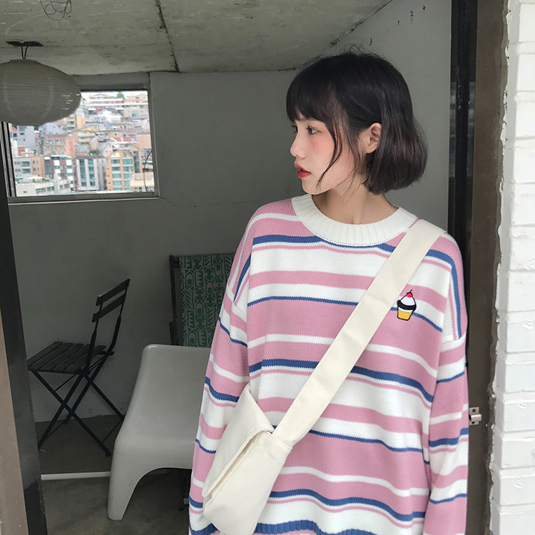 / 秋季女裝韓版慵懶風寬松拼色條紋卡通刺繡網紅套頭針織衫毛衣外套
