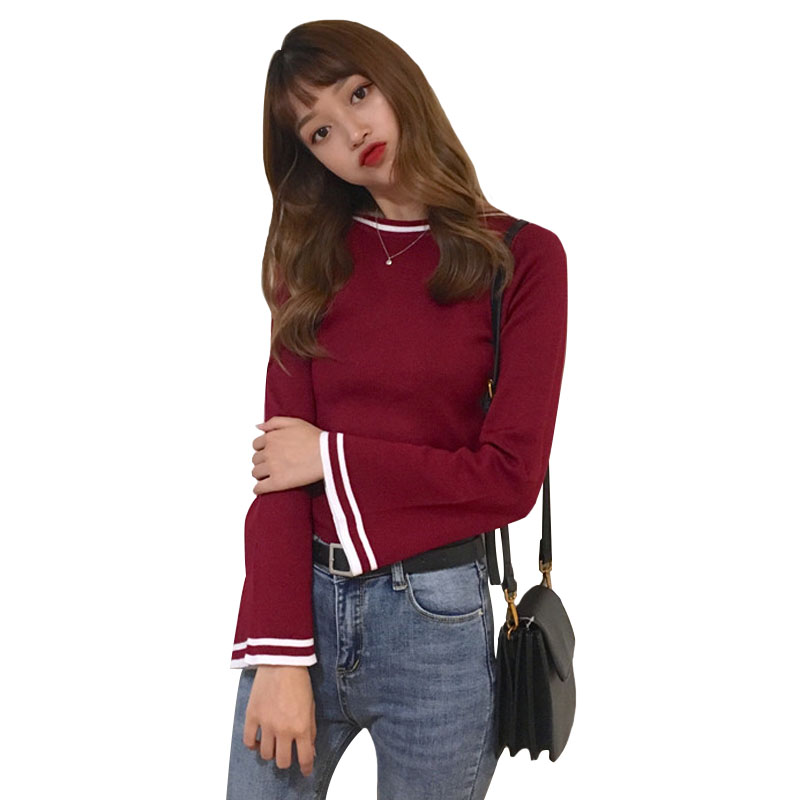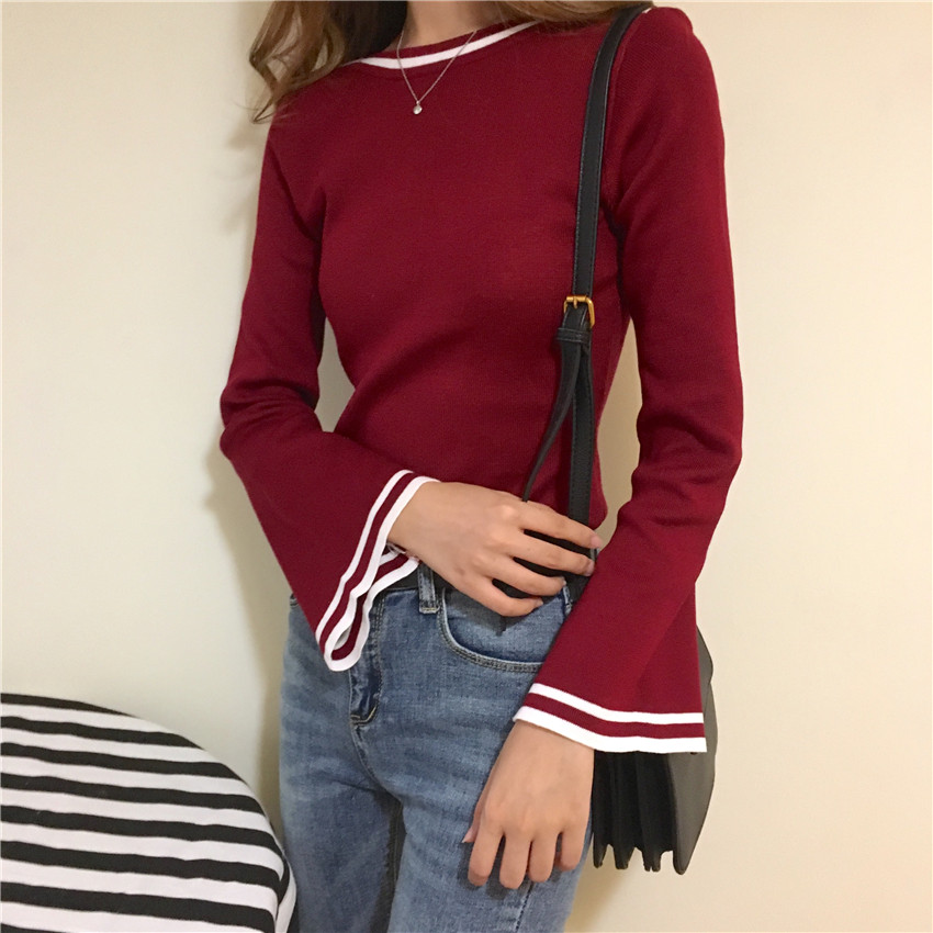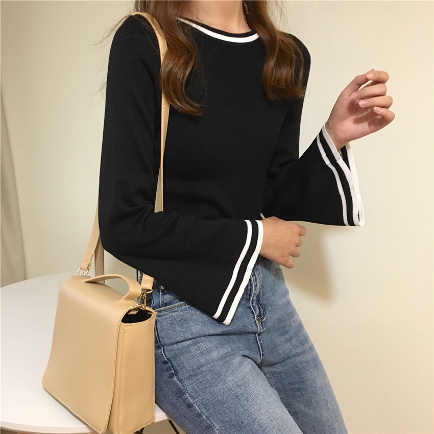 秋季女裝韓版修身顯瘦氣質套頭喇叭袖針織衫長袖打底衫毛衣上衣潮