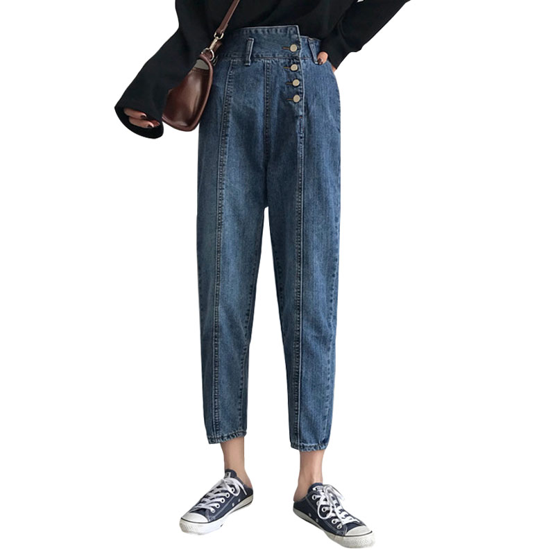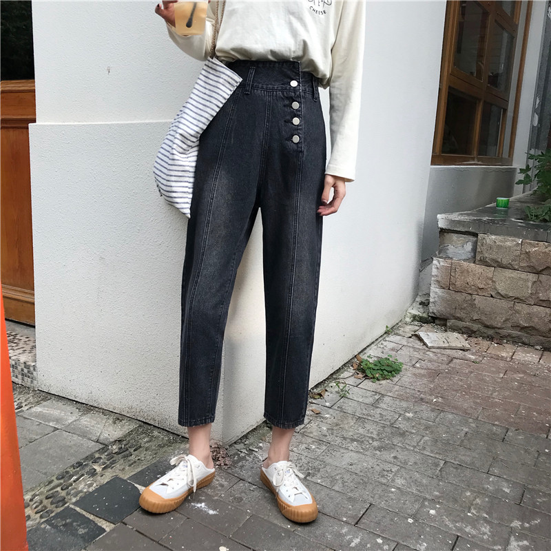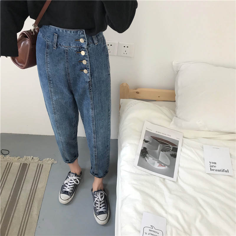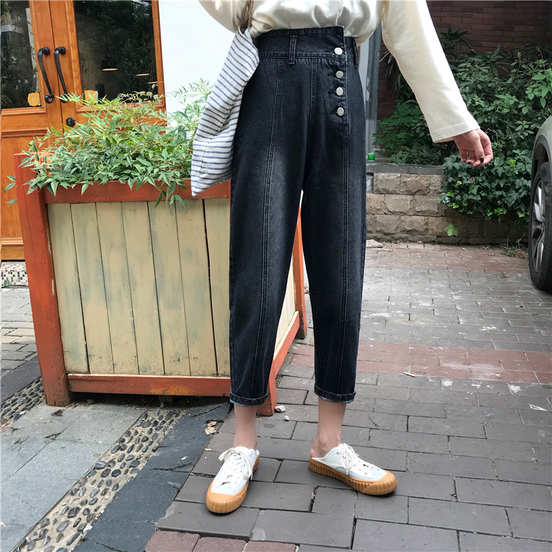 秋季2018新款女裝韓版寬松排扣高腰牛仔褲學生直筒褲哈倫褲九分褲