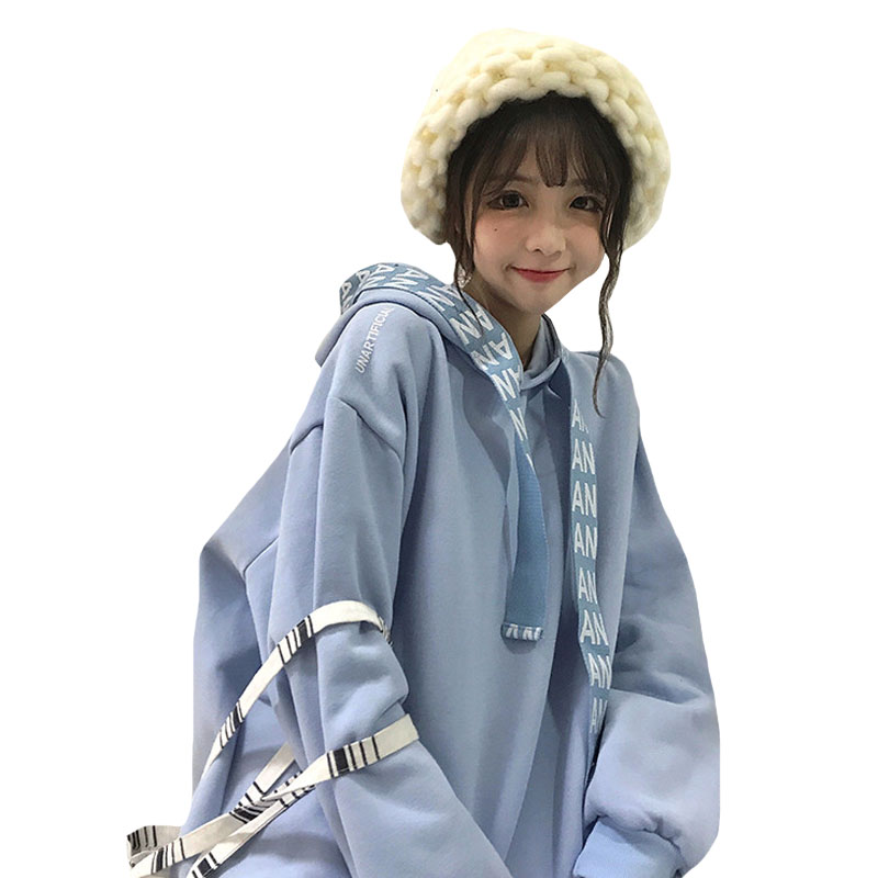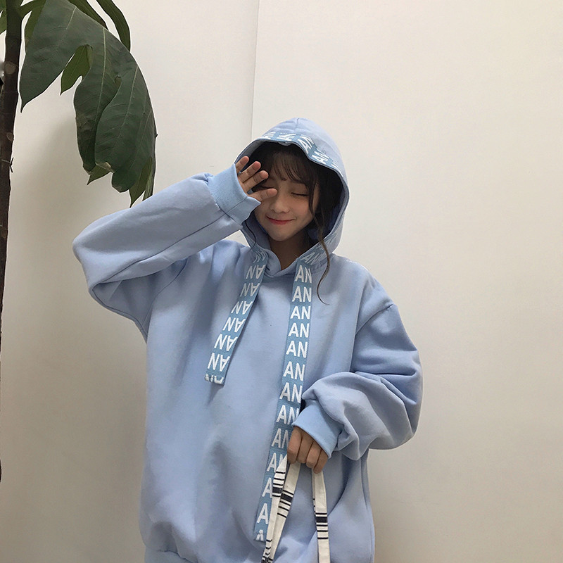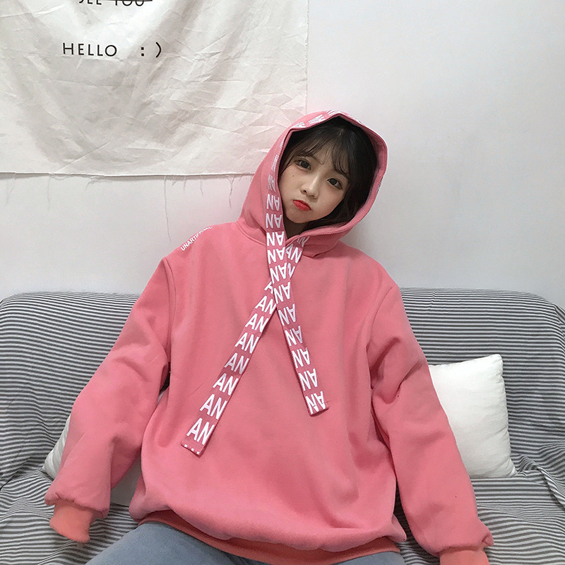 / 秋季女裝韓版中長款慵懶風寬松字母加絨加厚連帽套頭超火衛衣外套