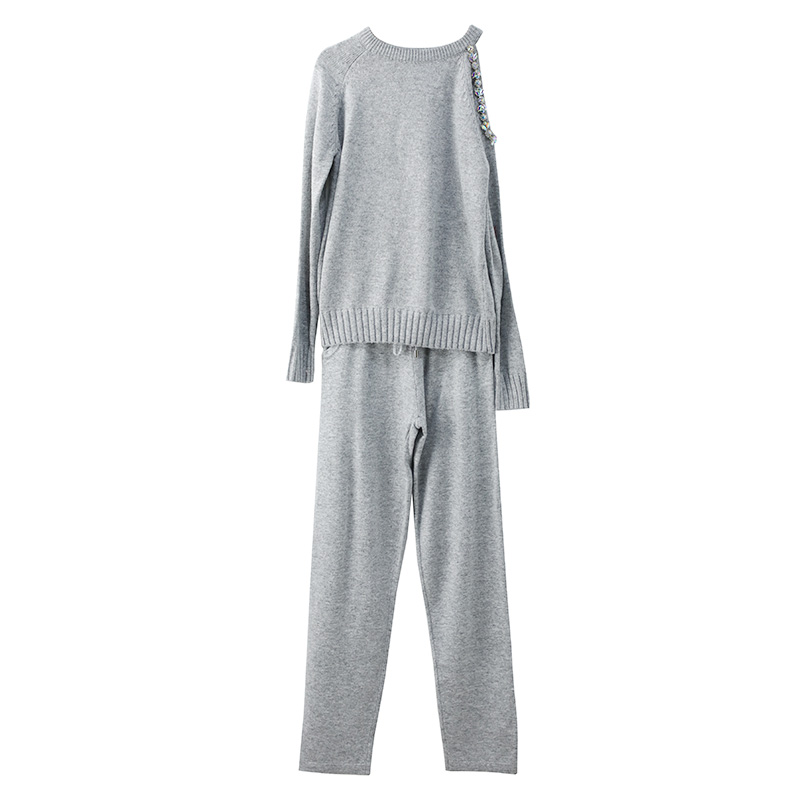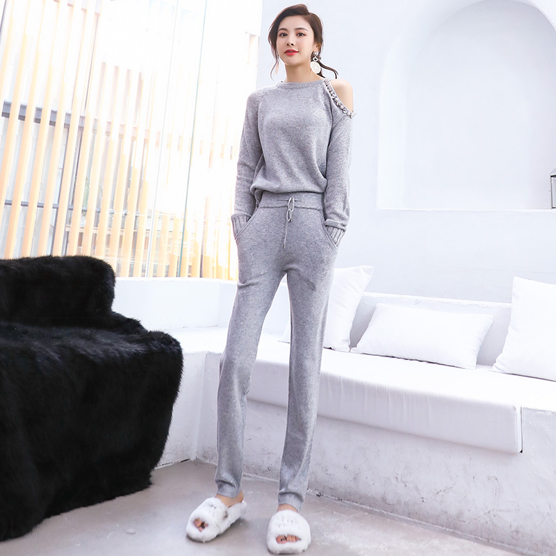 毛衣套裝女2018新款慵懶風寬松休閑收腰氣質露肩針織長褲兩件套潮