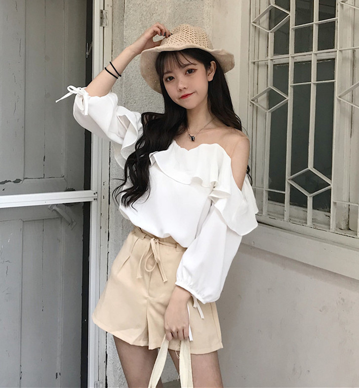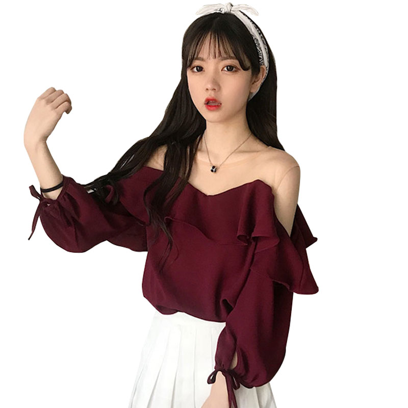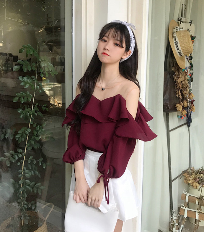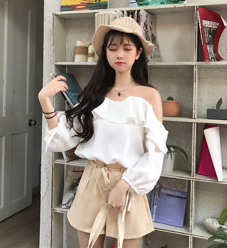 / 夏裝女裝韓版寬松網紗拼接露肩雪紡衫氣質甜美七分袖蕾絲T恤上衣