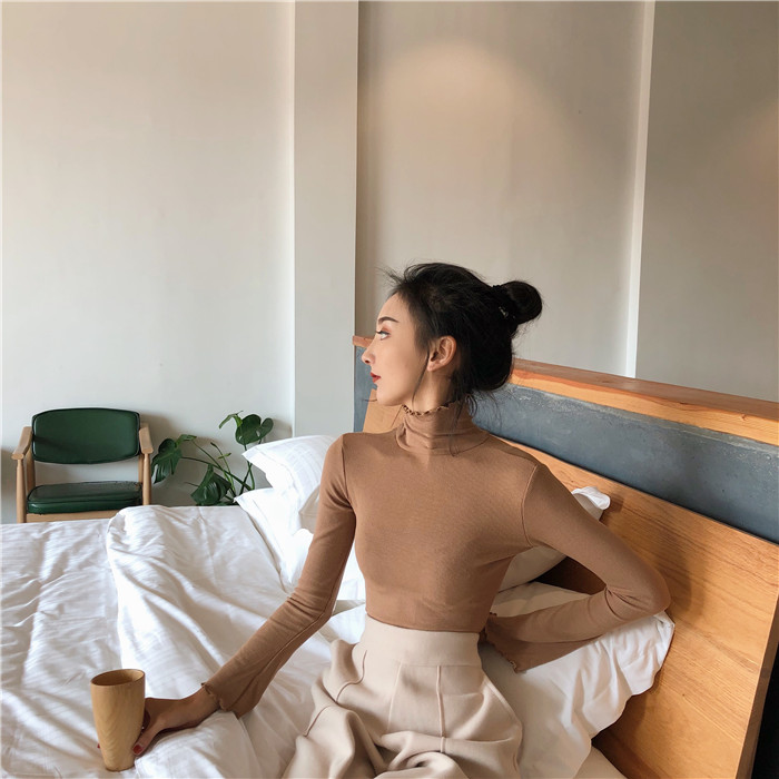 / 秋季韓版復古純色螺紋修身顯瘦高領套頭長袖打底衫T恤上衣學生女