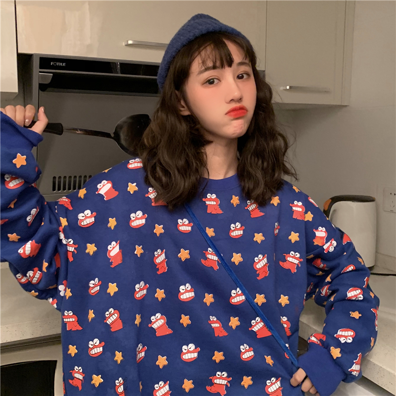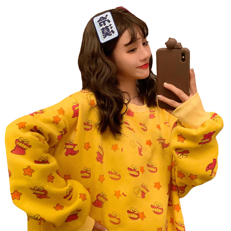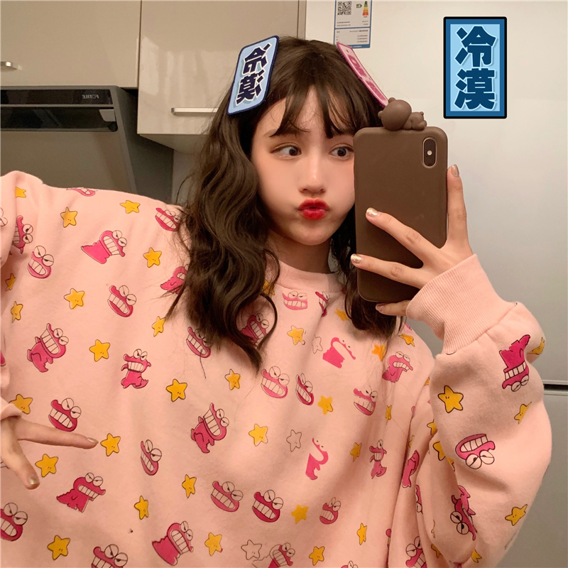 / 秋冬女裝韓版寬松原宿風個性卡通涂鴉慵懶風加絨加厚衛衣上衣外套