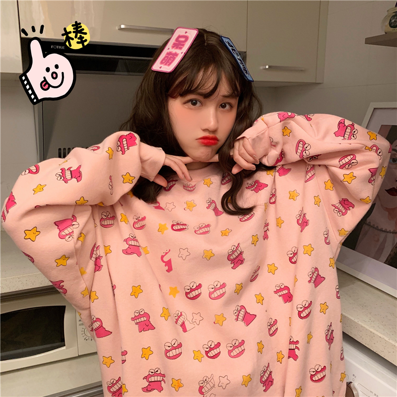秋冬女裝韓版寬松原宿風個性卡通涂鴉慵懶風加絨加厚衛衣上衣外套