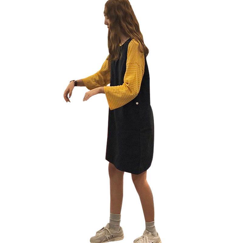 / 韓版時尚休閑套裝秋裝女裝條紋長袖T恤+中長款側排扣背心裙兩件套