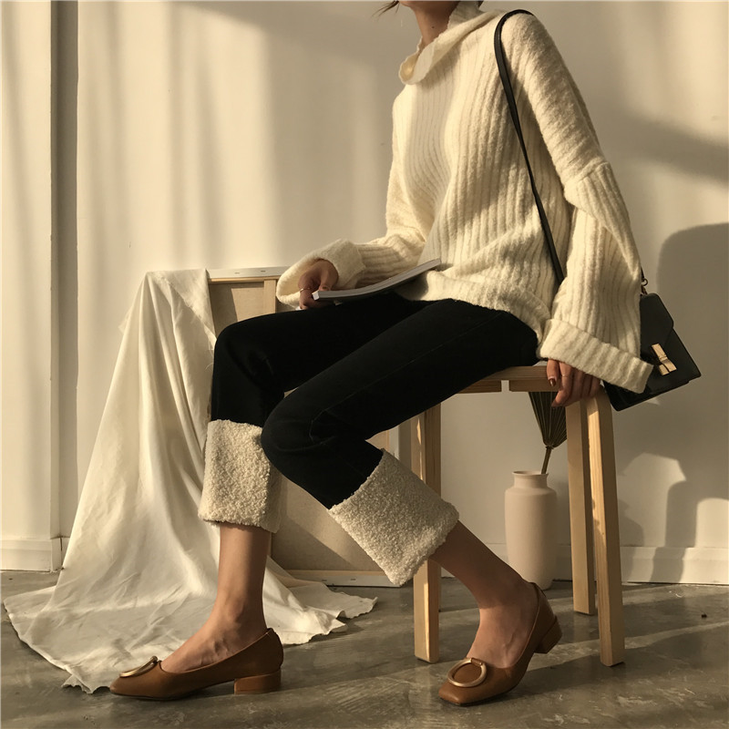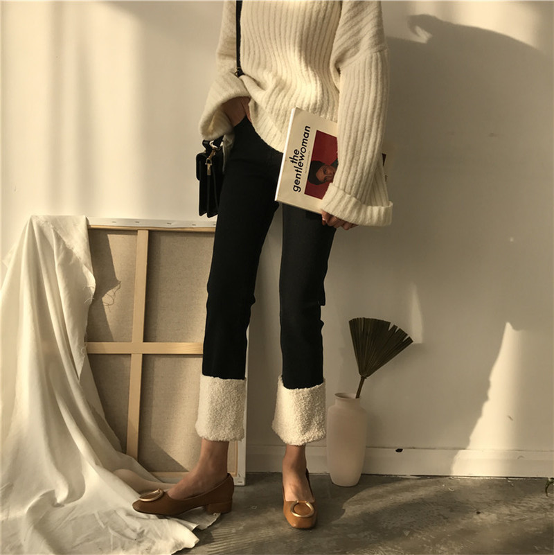 / 秋冬韓版寬松高腰直筒褲仿羊羔毛拼接彈力牛仔褲九分褲學生褲子女