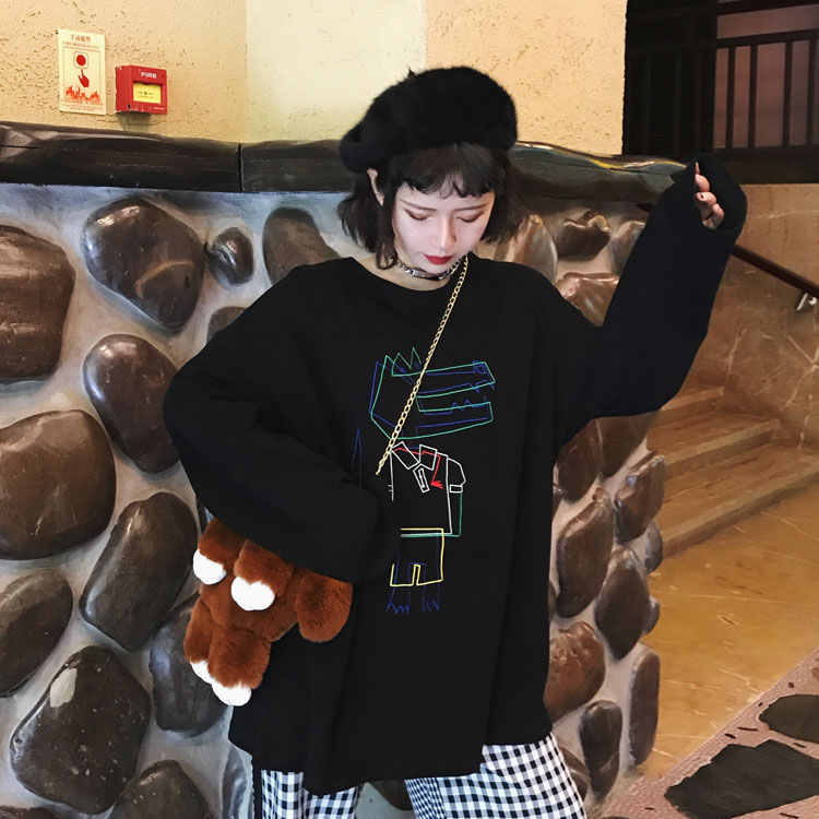 / 秋季韓版中長款原宿BF風寬松搞怪鱷魚刺繡薄款長袖T恤顯瘦上衣女