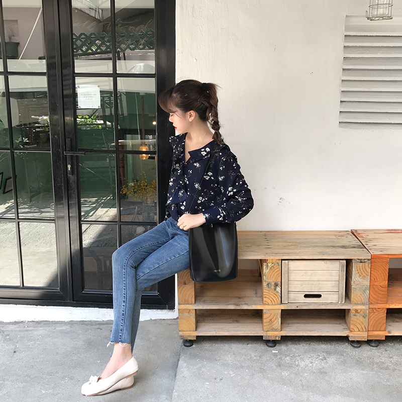春裝女裝韓版高腰百搭修身顯瘦毛邊牛仔褲鉛筆褲淺藍色小腳褲學生