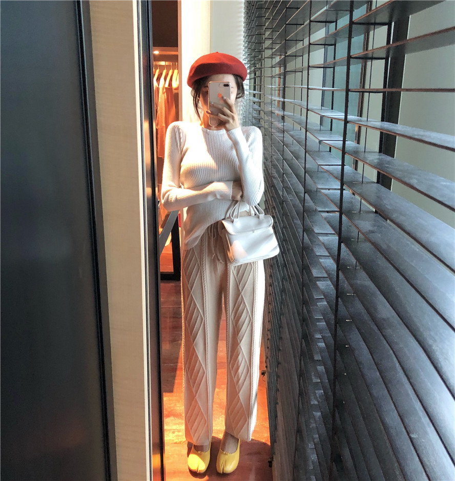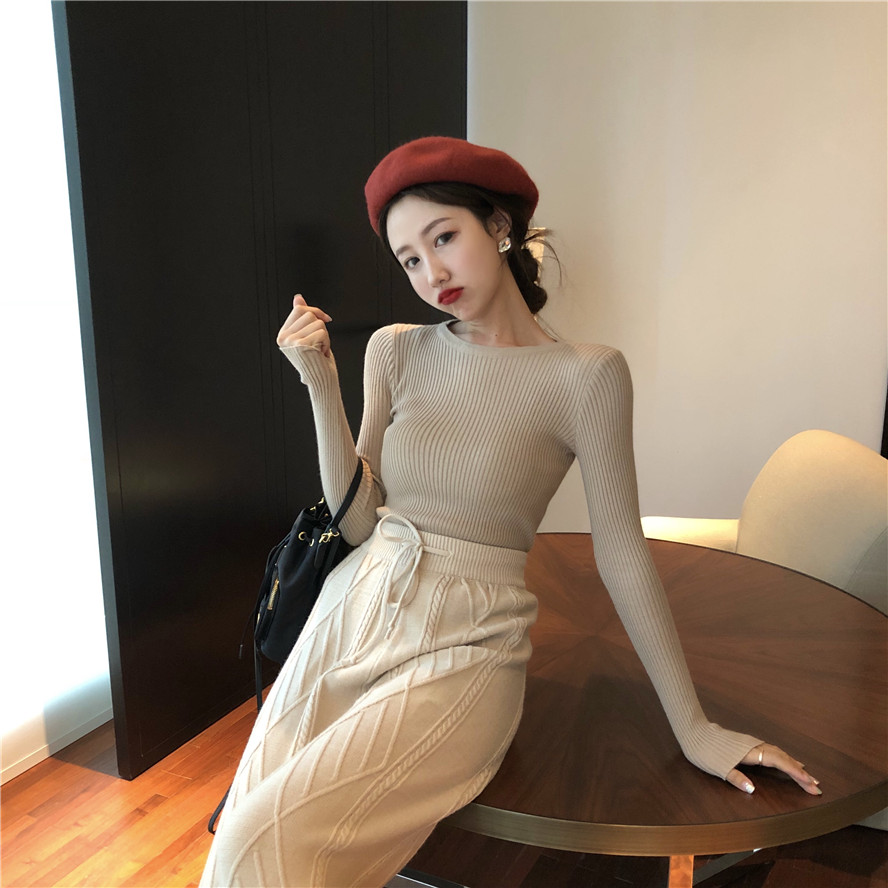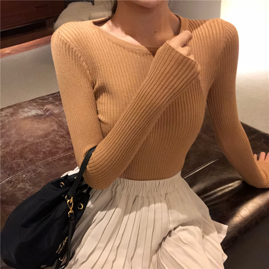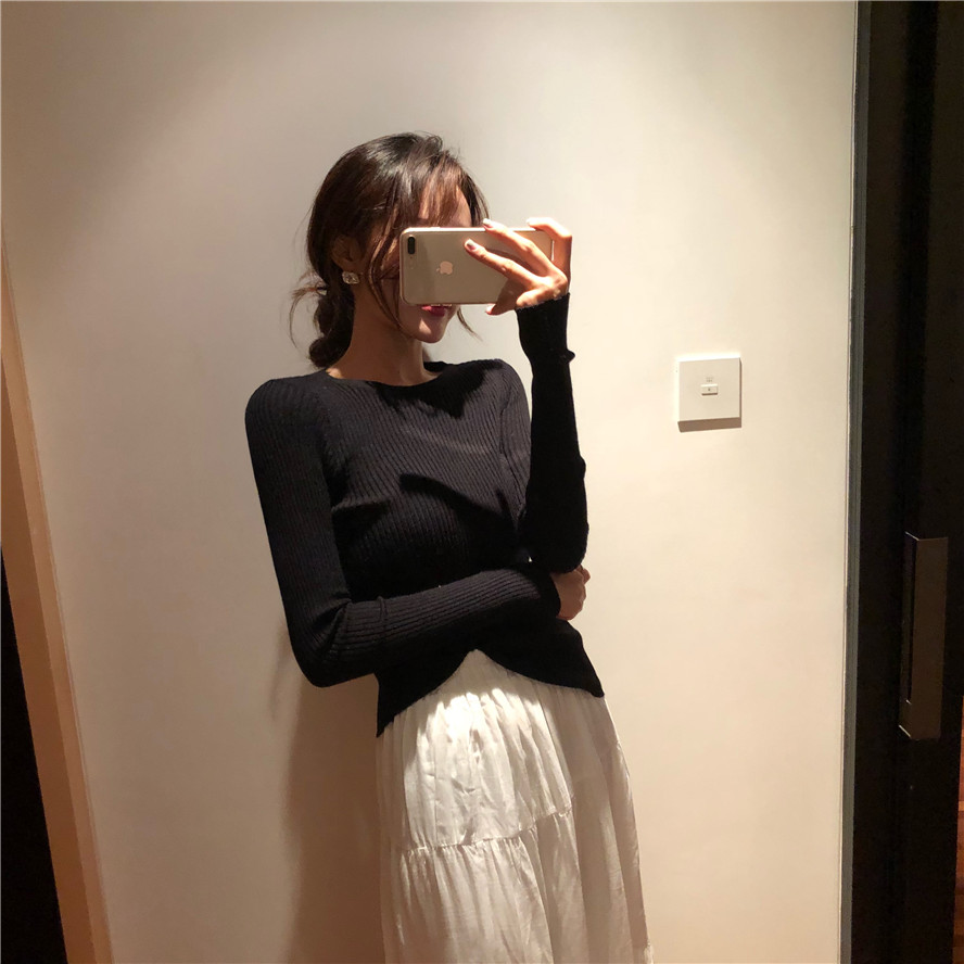 / 復古港味2018秋新款修身顯瘦百搭純色韓版針織長袖圓領打底衫上衣