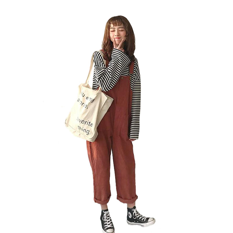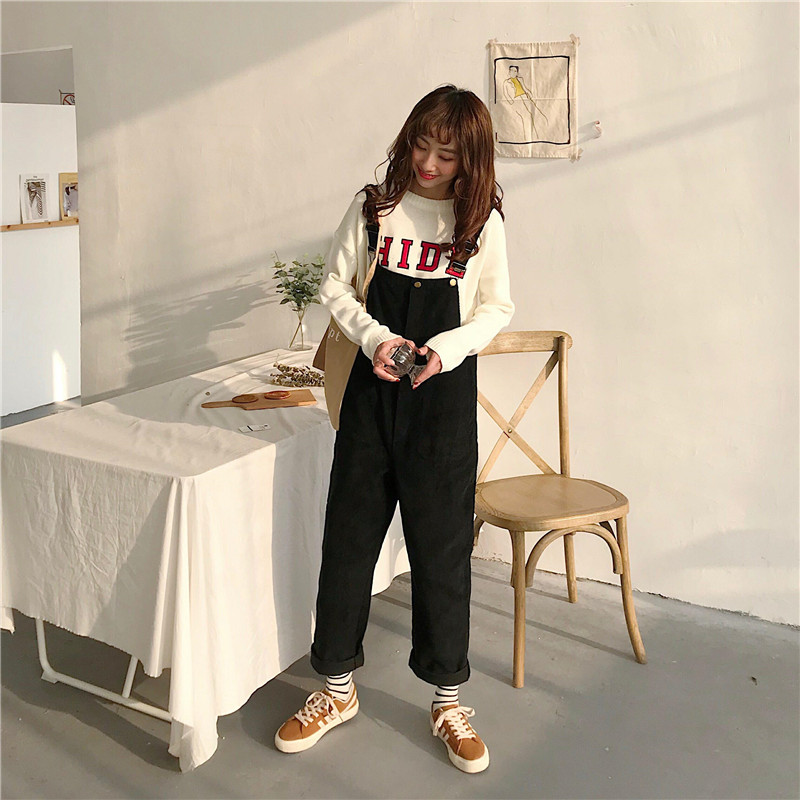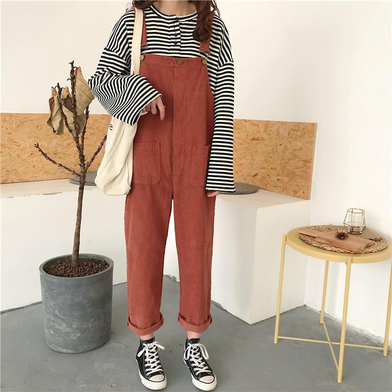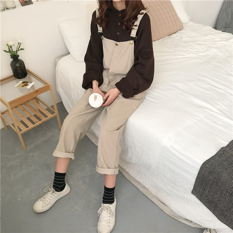 / 秋裝女裝韓版寬松燈芯絨背帶褲哈倫褲連體長褲休閑褲闊腿褲九分褲