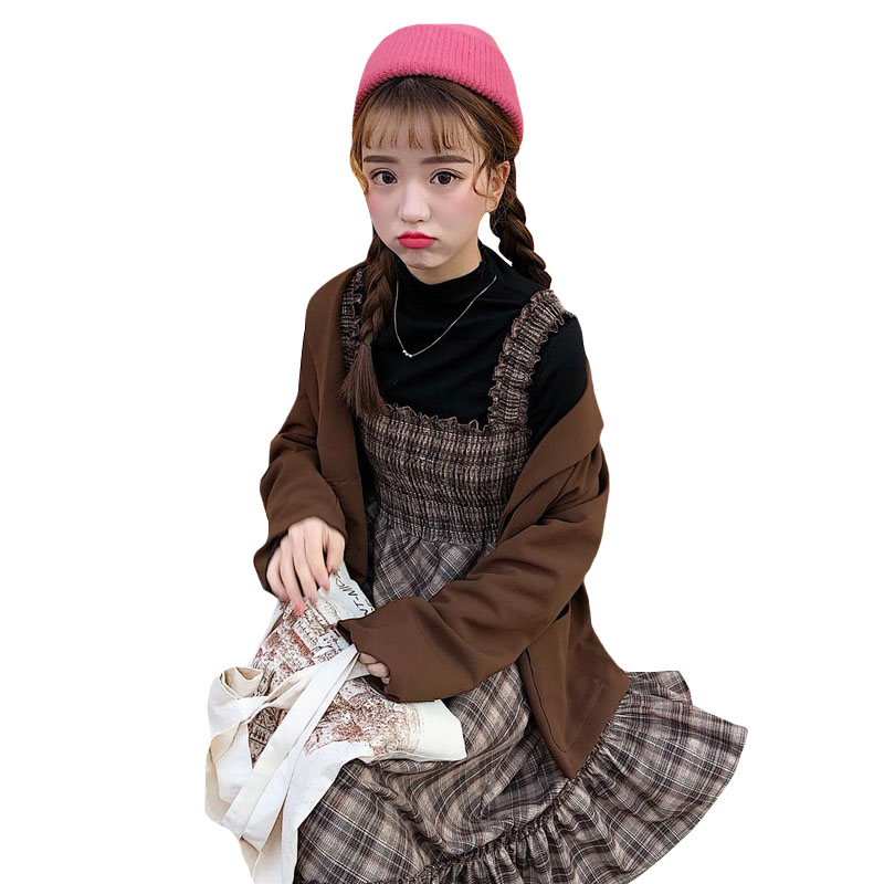 / 秋季女裝韓版氣質收腰顯瘦格子背帶裙學生中長款荷葉邊連衣裙長裙