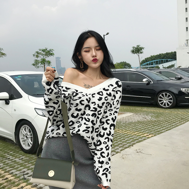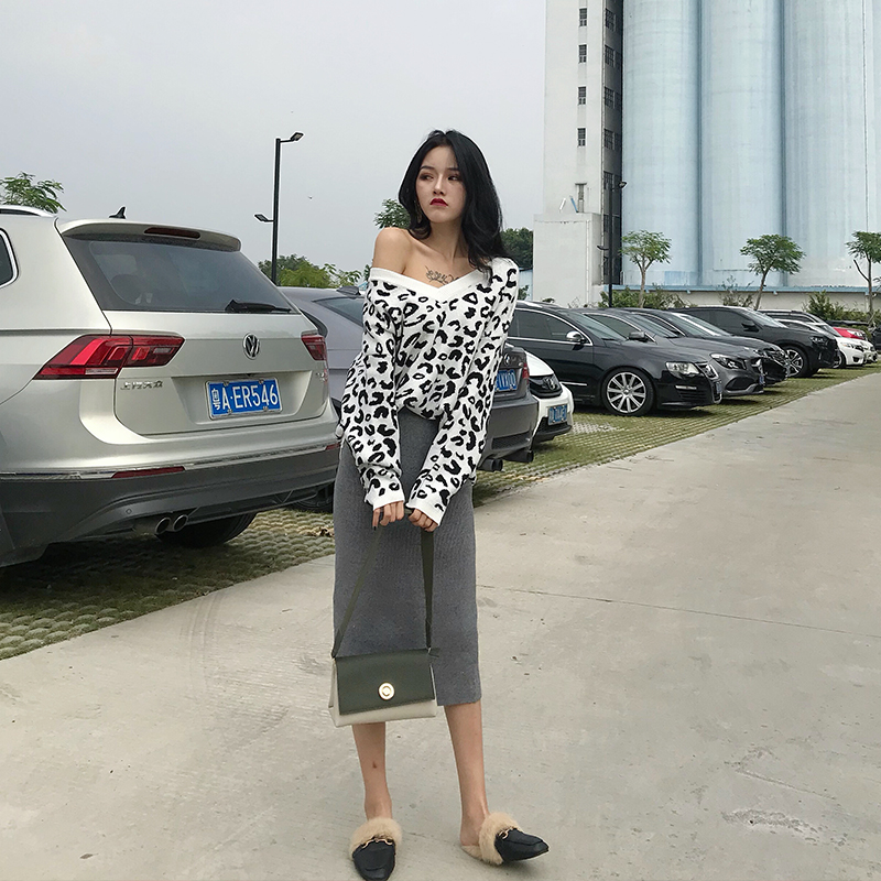 新款韓版斑點時尚風V領寬松上衣+復古chic純色中長裙針織衫裙套裝