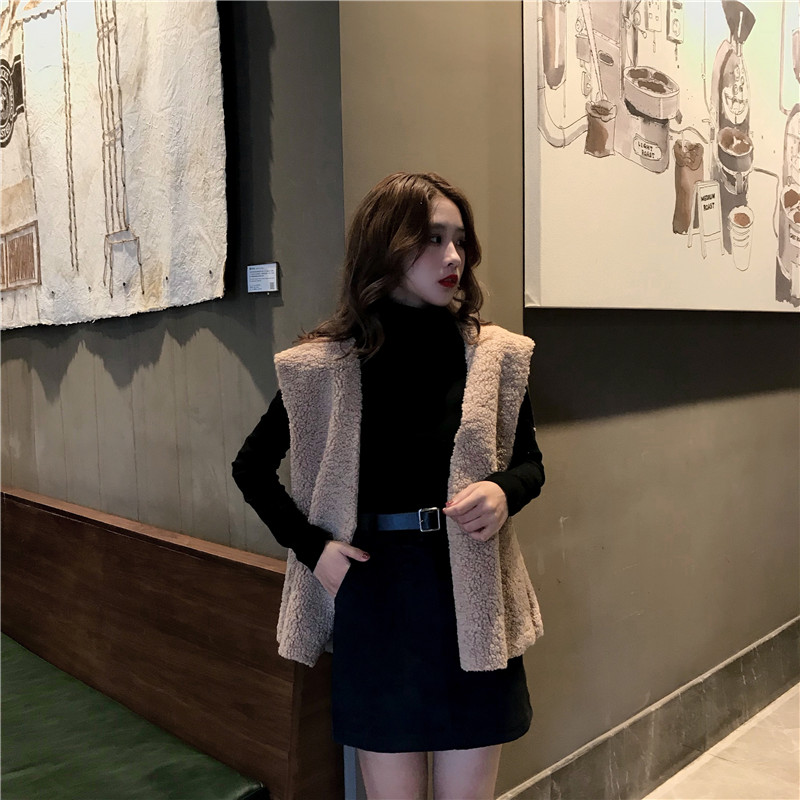 / 韓版時尚休閑套裝秋季女裝仿羊羔毛馬甲+打底衫+高腰半身裙三件套
