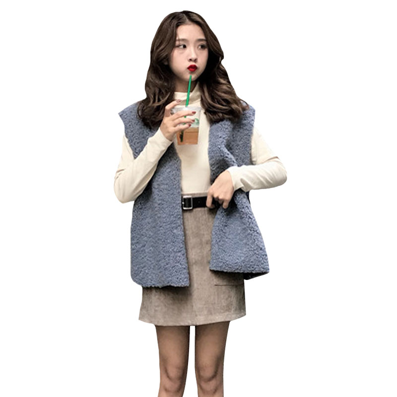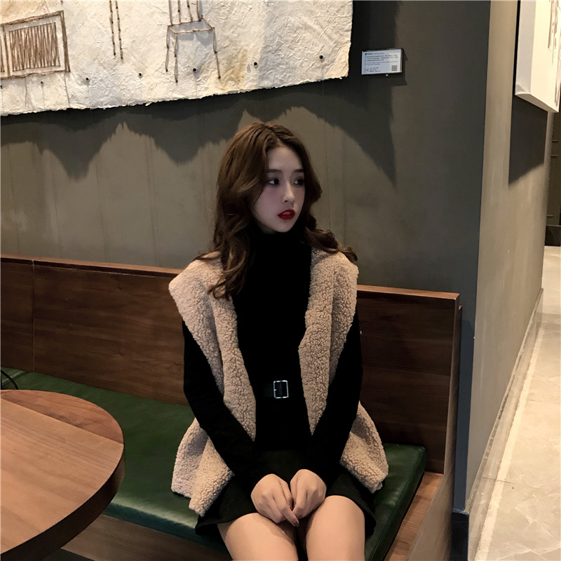 韓版時尚休閑套裝秋季女裝仿羊羔毛馬甲+打底衫+高腰半身裙三件套